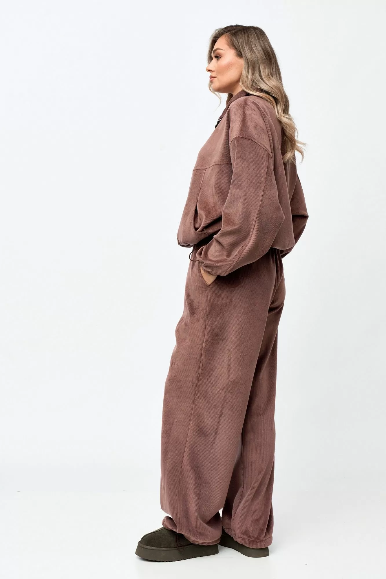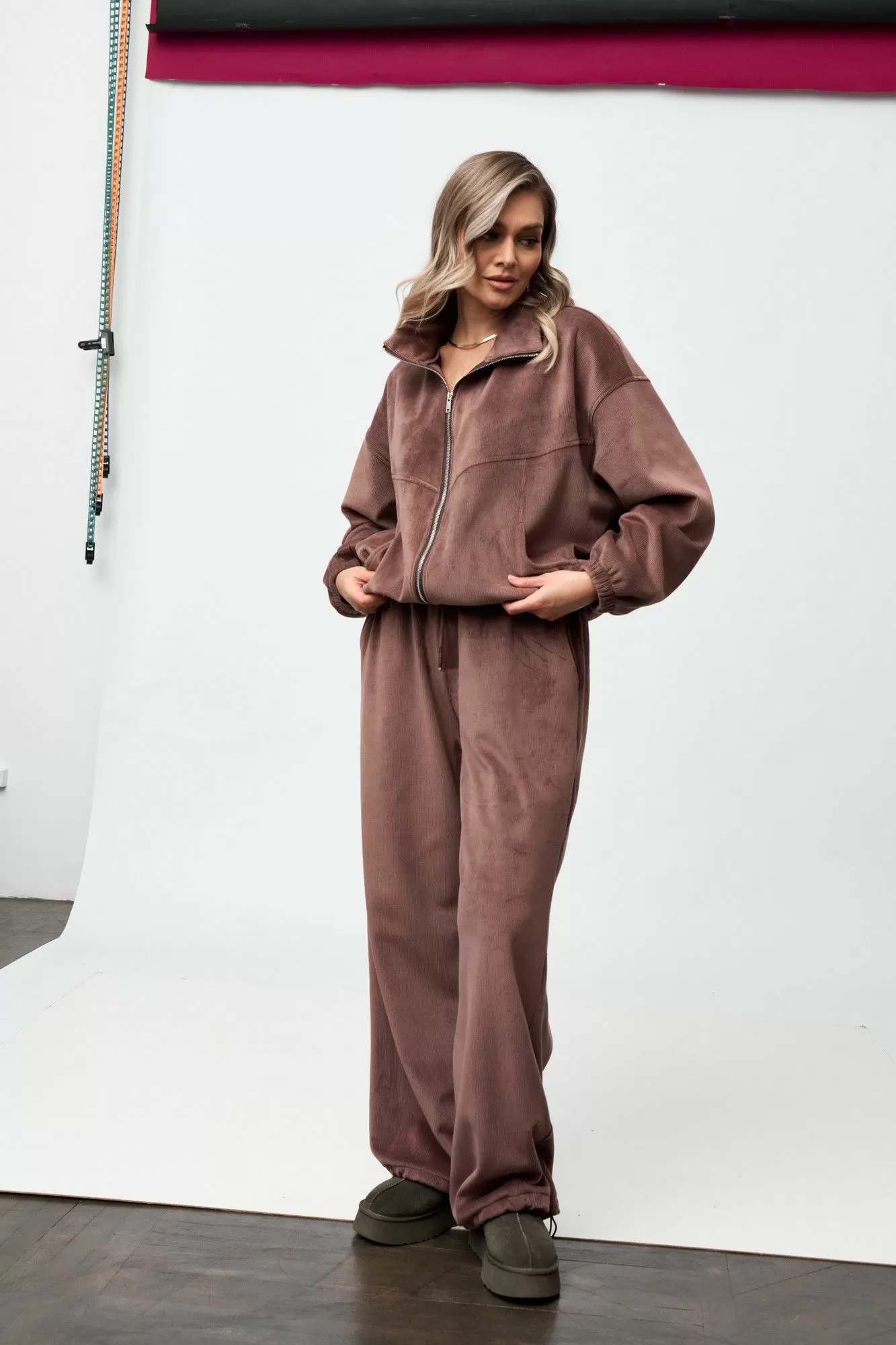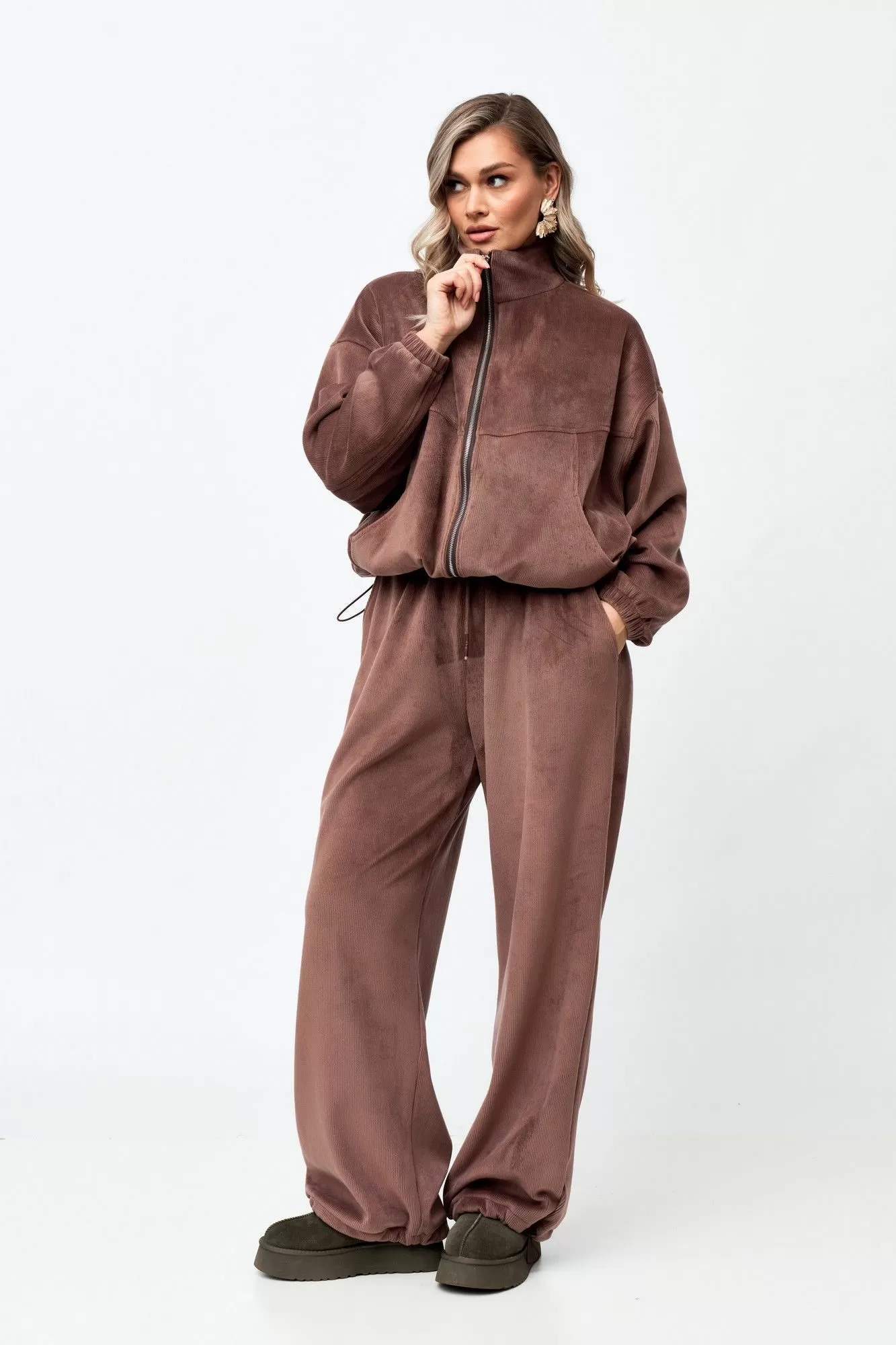 Костюм спортивный женский состоит из джемпера и брюк. Костюм выполнен из велюровой ткани в рубчик.