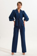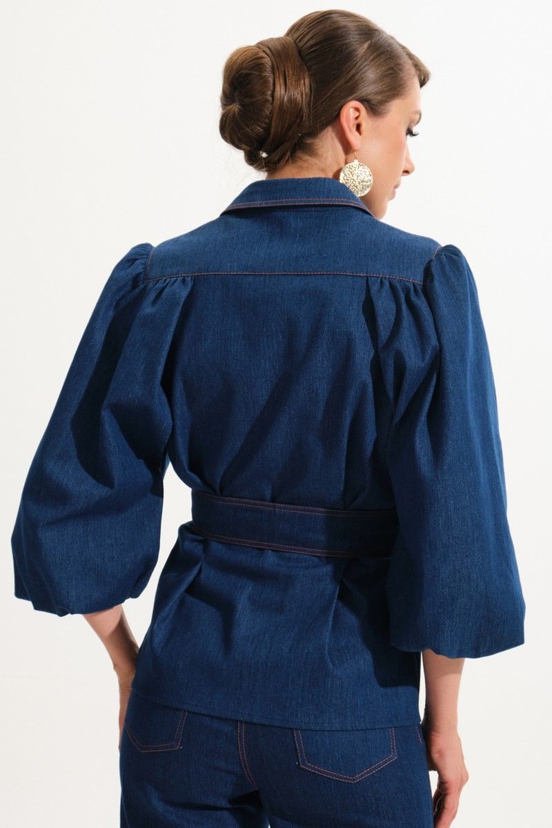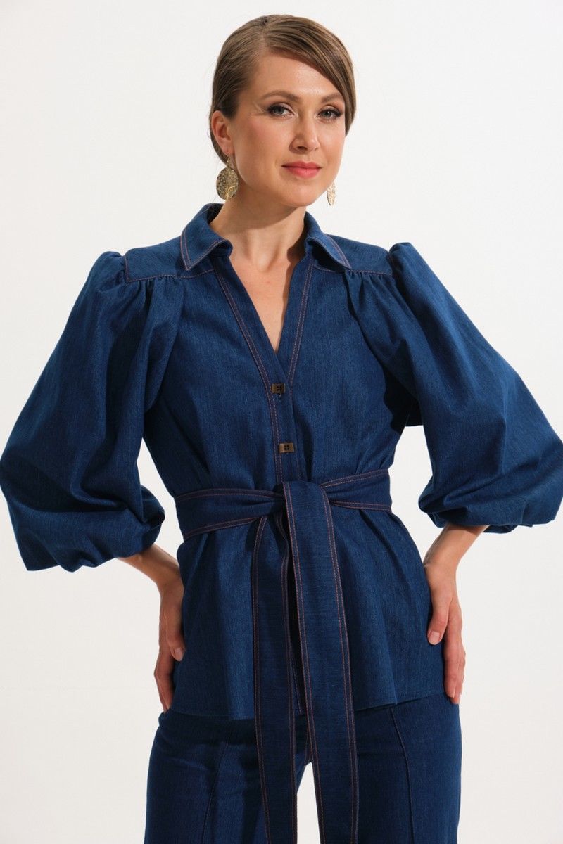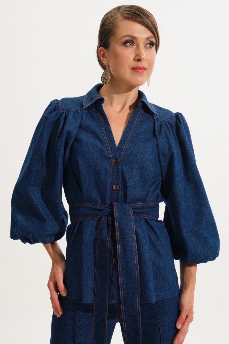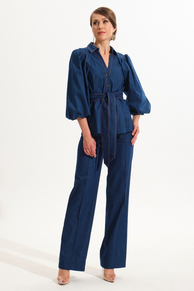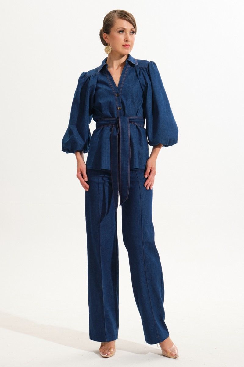 Костюм женский, состоит из жакета и брюк. Жакет полуприталенного силуэта.Перед с центральной бортовой застежкой на петли-пуговицы.Планка переда отрезная.На переде и спинке для придания приталивания застрочены складки.Воротник блузочного типа на отрезной стойке.Плечевой пояс обужен.Рукава втачные, одношовные типа "баллон" с разрезом в нижнем шве. Нижний рукав выполнен из Х/Б подкладки.По окату рукава и в швах втачивания в кокетки переда и спинки выполнена сборка.Низ рукава обработан резинкой.Имеется навесной отделочный пояс.Брюки прямого силуэта с центральной застёжкой на молнию и петлю-пуговицу.По передним половинкам застрочены канты.В боковых швах карманы.Задние половинки с отрезными кокетками и накладными карманами.Пояс притачной.