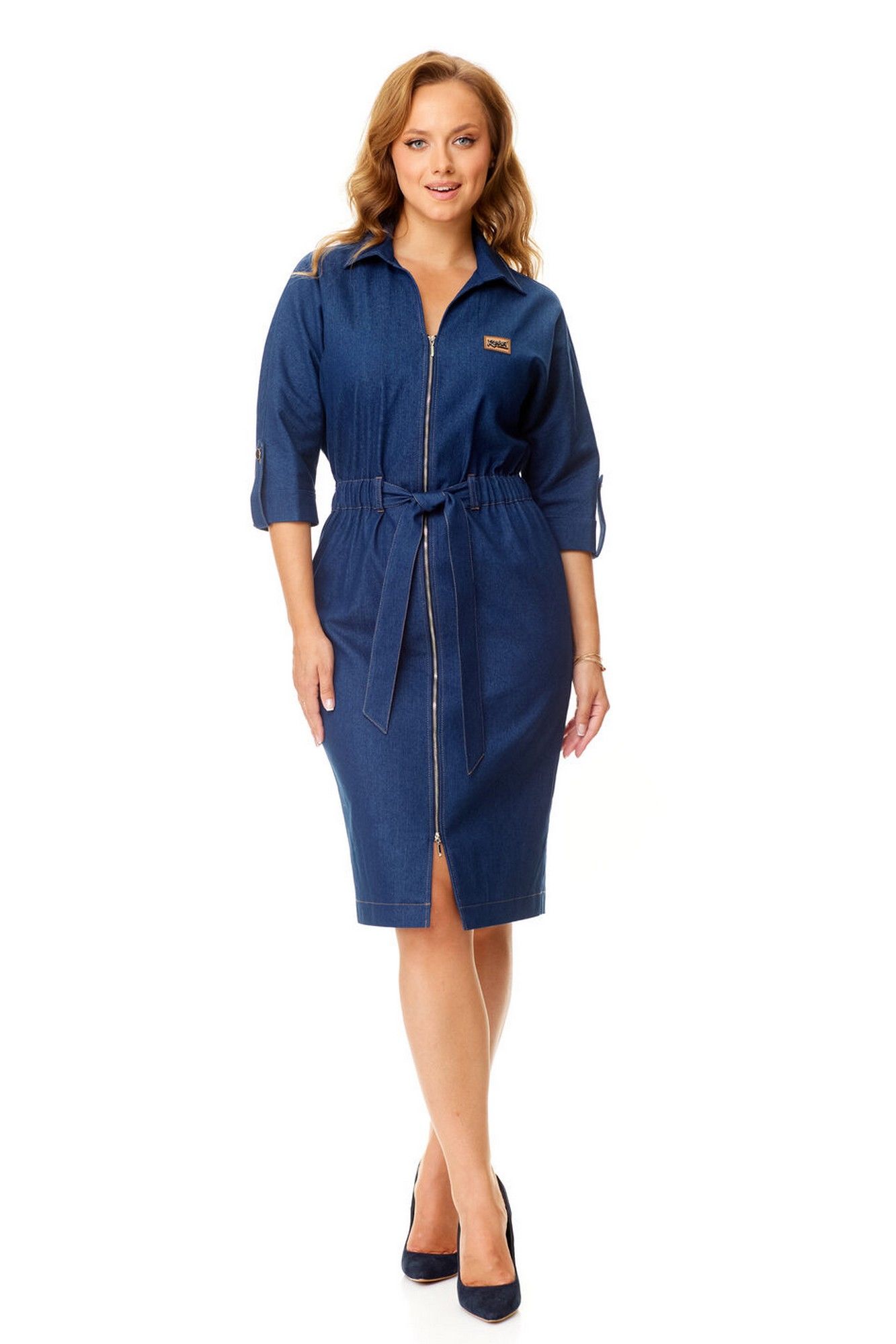 Платье женское полуприталенного силуэта, заужено к низу. Рукав цельнокроеный типа "летучая мышь" длиной 3/4. Низ рукава с отложной манжетой и патой. Горловина обработана блузочным воротником на отрезной стойке. Перед с застежкой на металлизированную тесьму-молнию. Для придания силуэтности платью, по линии талии настрочена кулиса с резинкой, переходящая в завязки пояса.