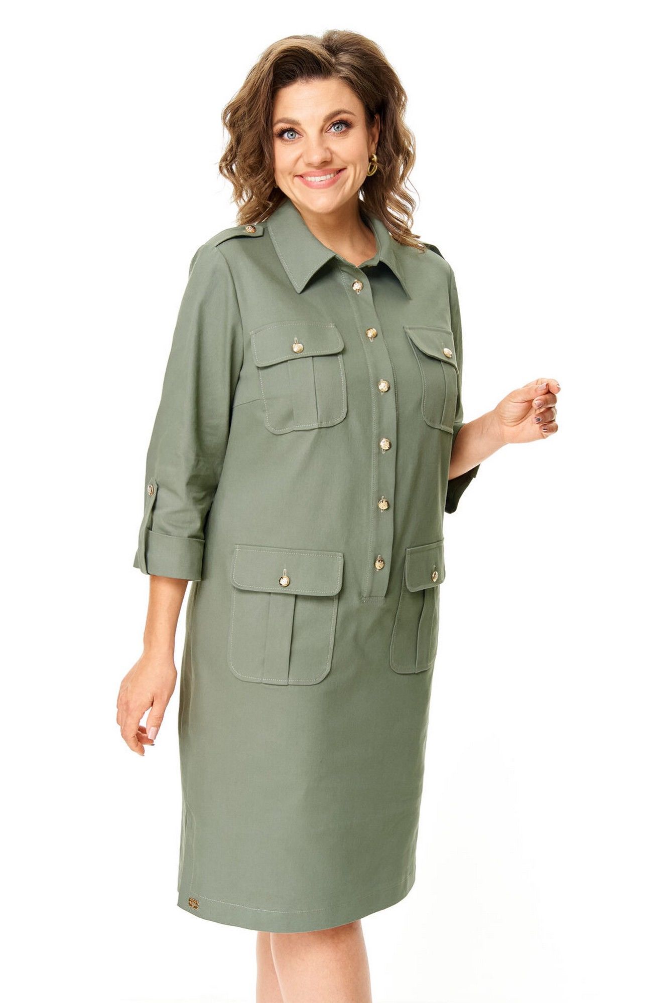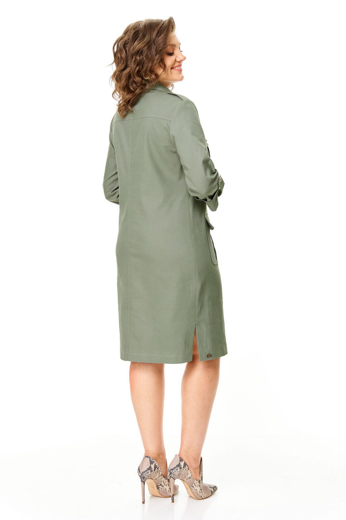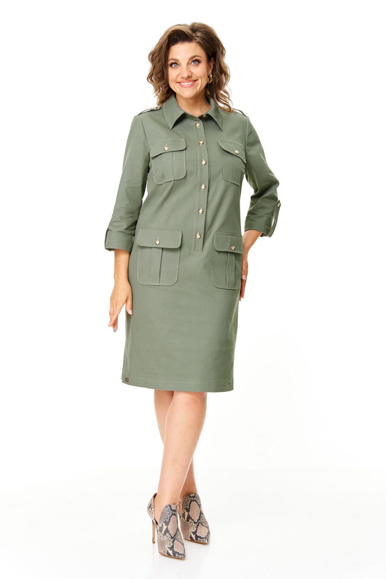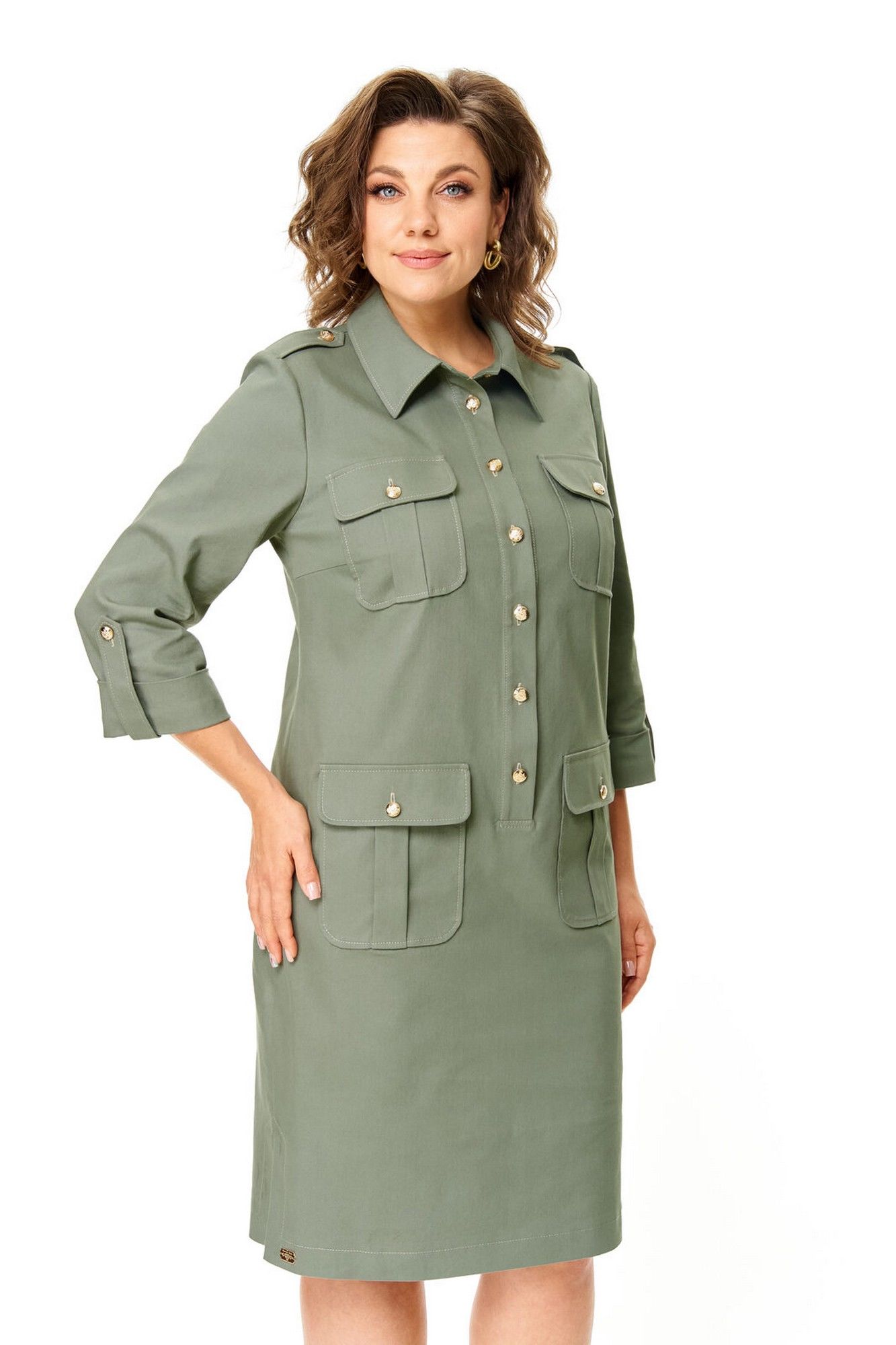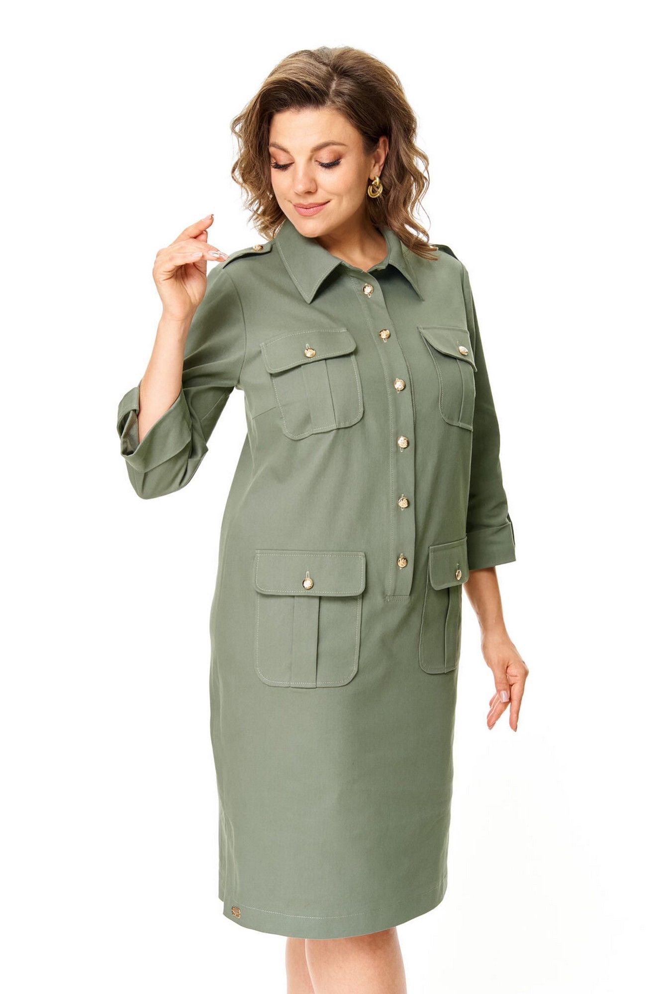 Платье прямого силуэта с естественной линией плеча.Спинка со средним швом и кокеткой.Перед с нагрудными вытачками, накладными карманами и клапанами.По переду обработана отделочная отрезная планка с застежкой на петли-пуговицы.Рукав втачной одношовный длиной 3/4 с отделочной манжетой и патой по низу.На плечевых швах имеются отделочные паты с пуговицами.В боковых швах выполнены невысокие разрезы.На правой стороне переда, по низу, пришита декоративная нашивка.Отделочные строчки контрастного цвета.Вся фурнитура металлическая premium качества.