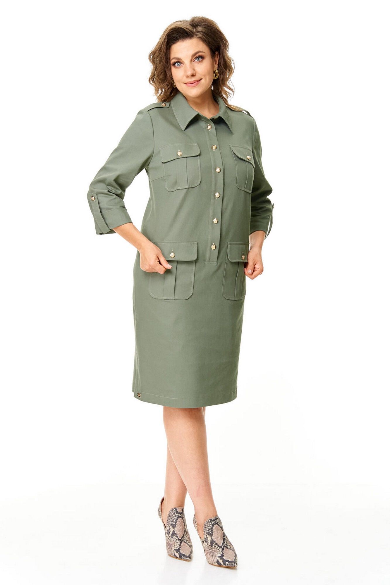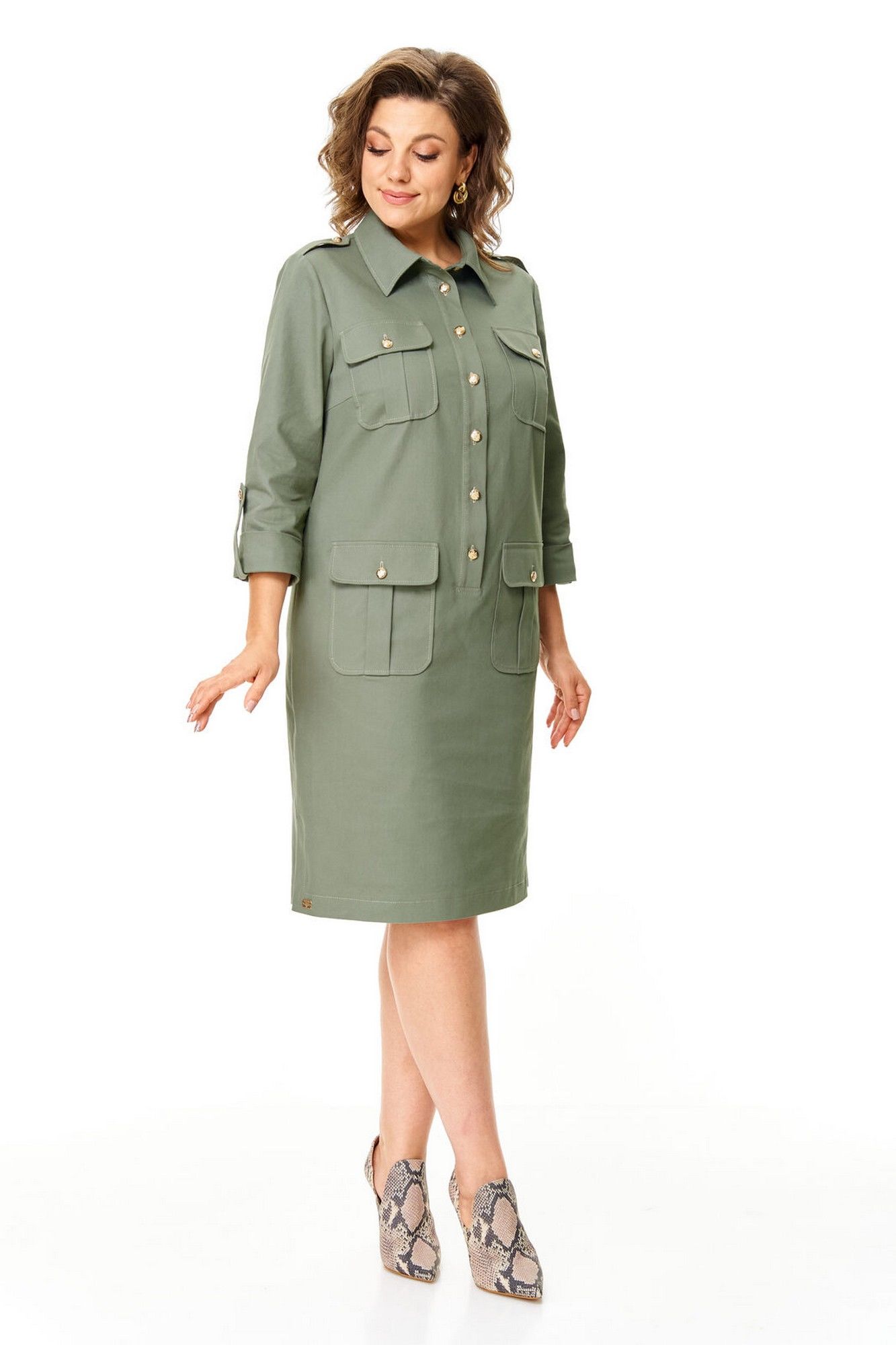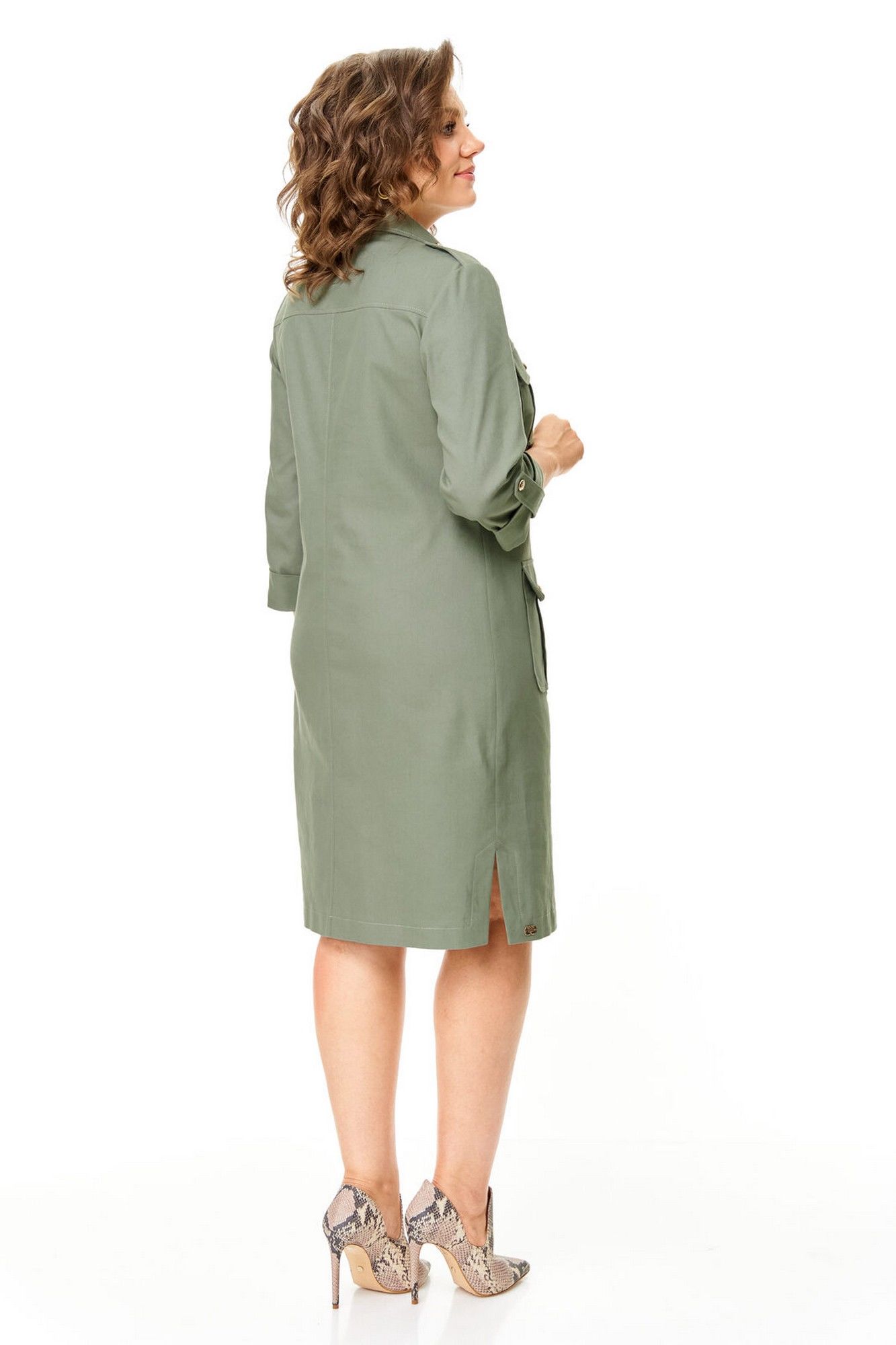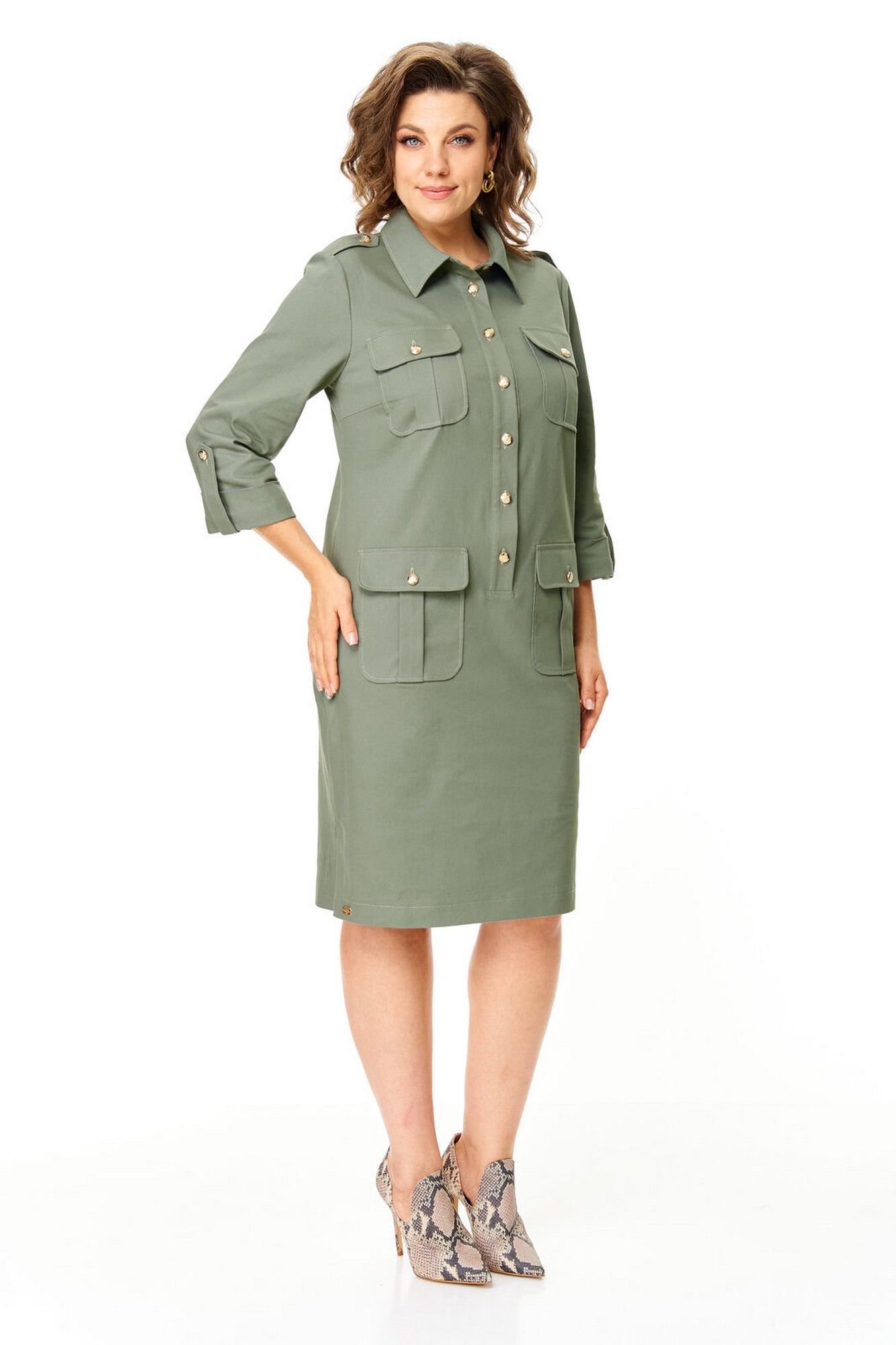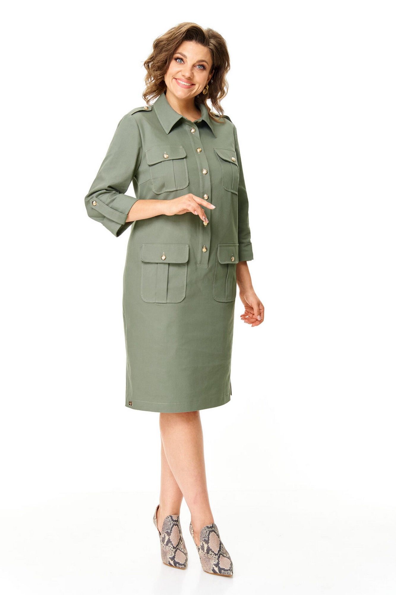 Платье прямого силуэта с естественной линией плеча.Спинка со средним швом и кокеткой.Перед с нагрудными вытачками, накладными карманами и клапанами.По переду обработана отделочная отрезная планка с застежкой на петли-пуговицы.Рукав втачной одношовный длиной 3/4 с отделочной манжетой и патой по низу.На плечевых швах имеются отделочные паты с пуговицами.В боковых швах выполнены невысокие разрезы.На правой стороне переда, по низу, пришита декоративная нашивка.Отделочные строчки контрастного цвета.Вся фурнитура металлическая premium качества.