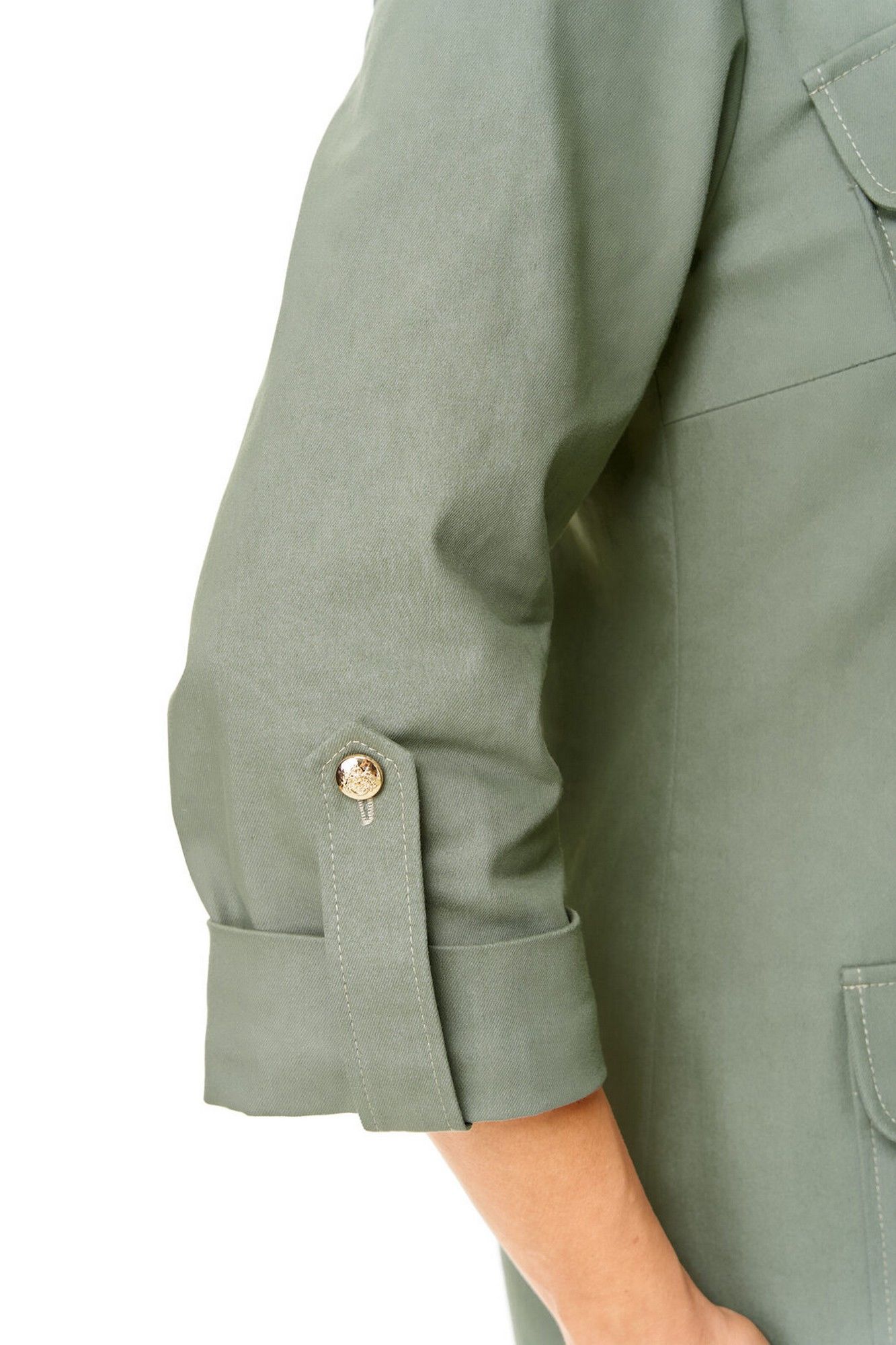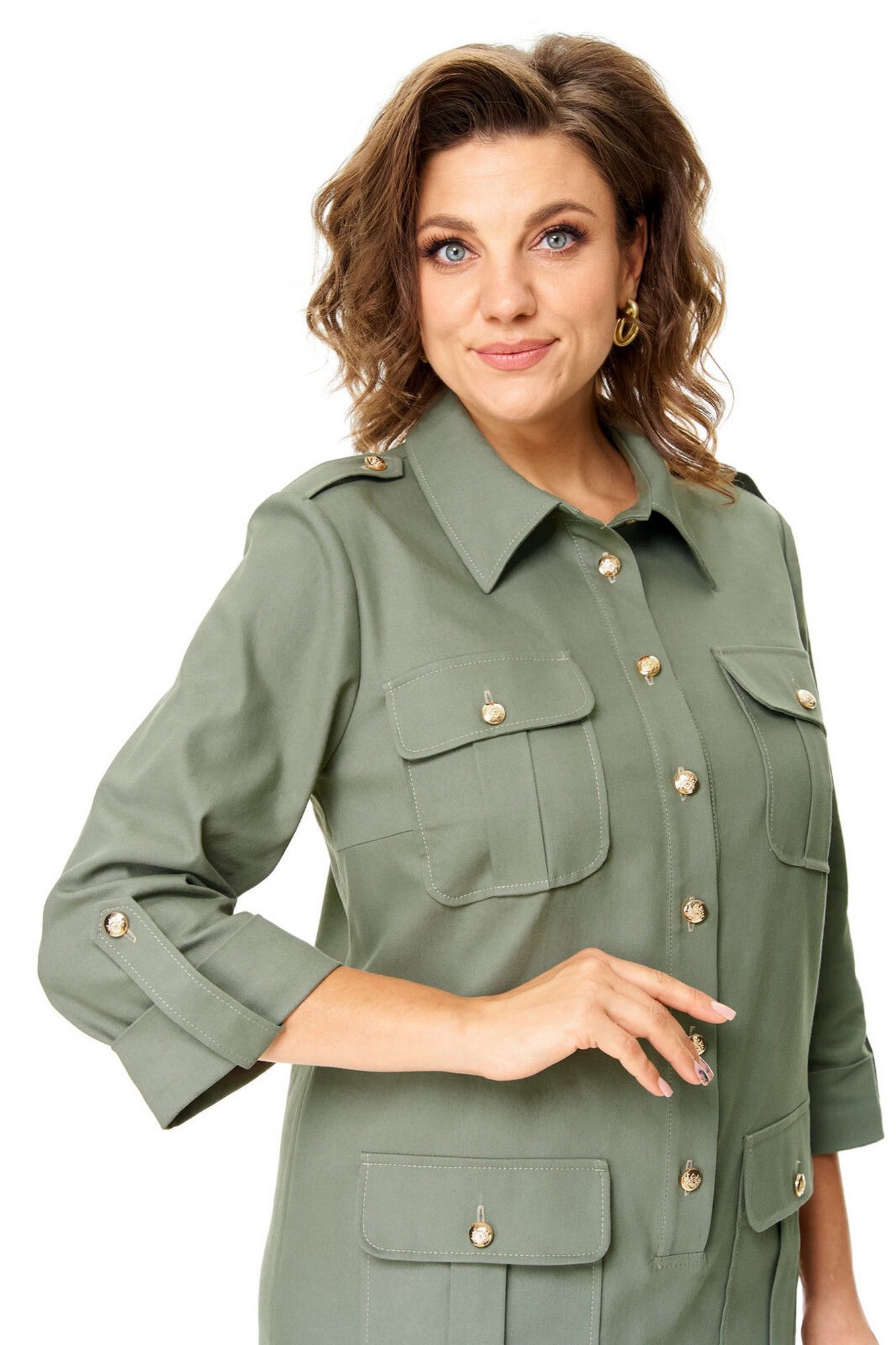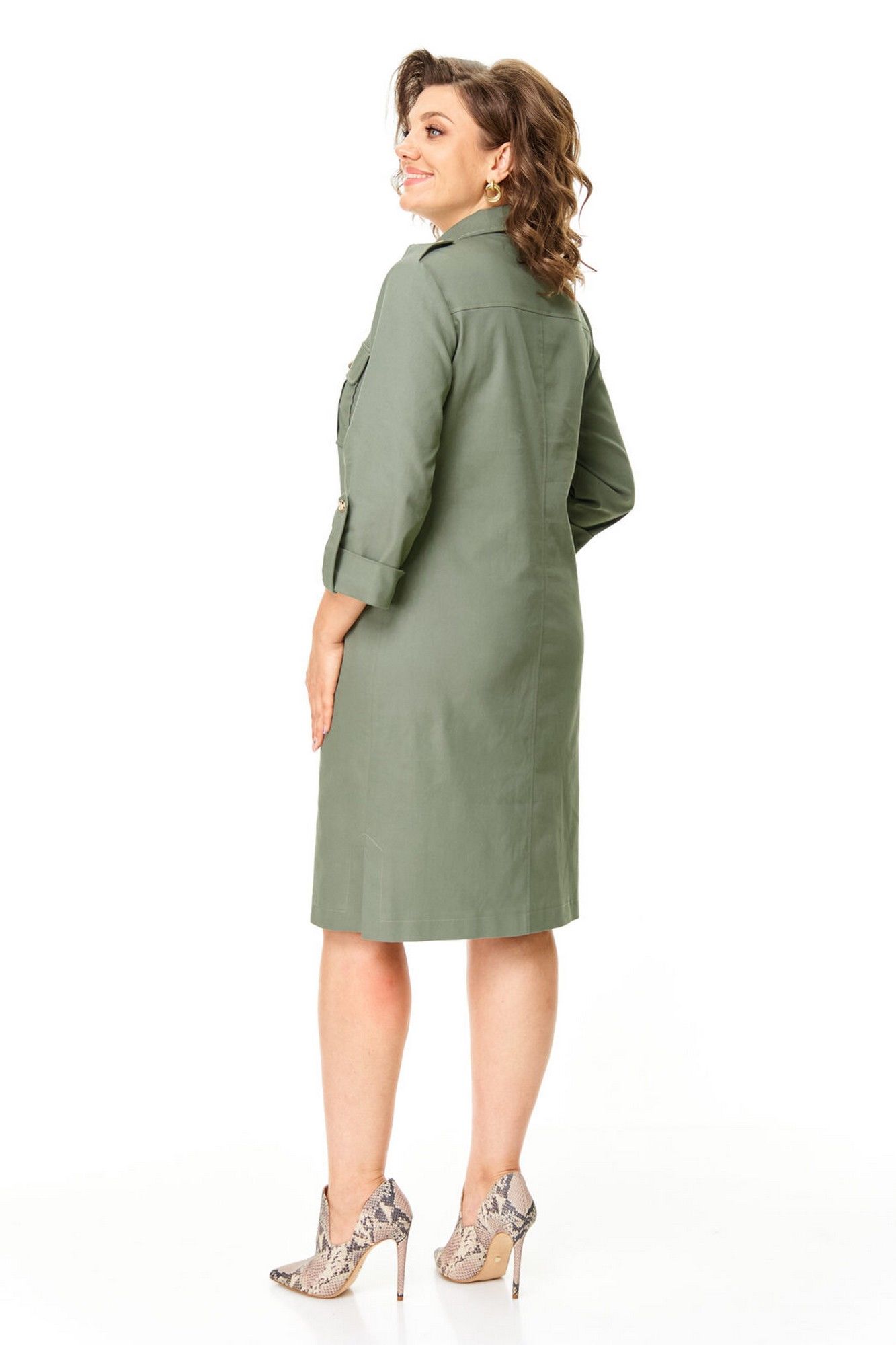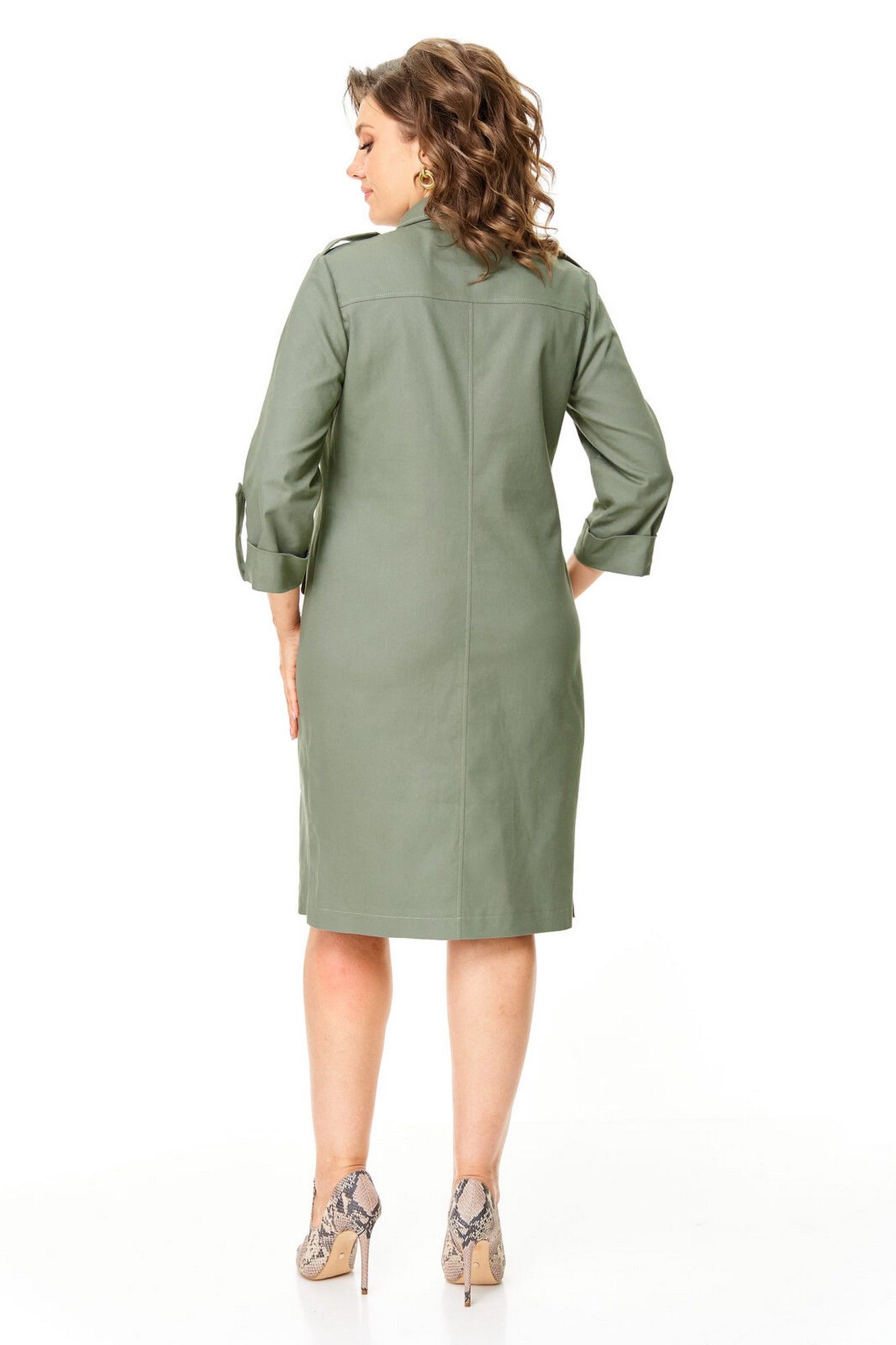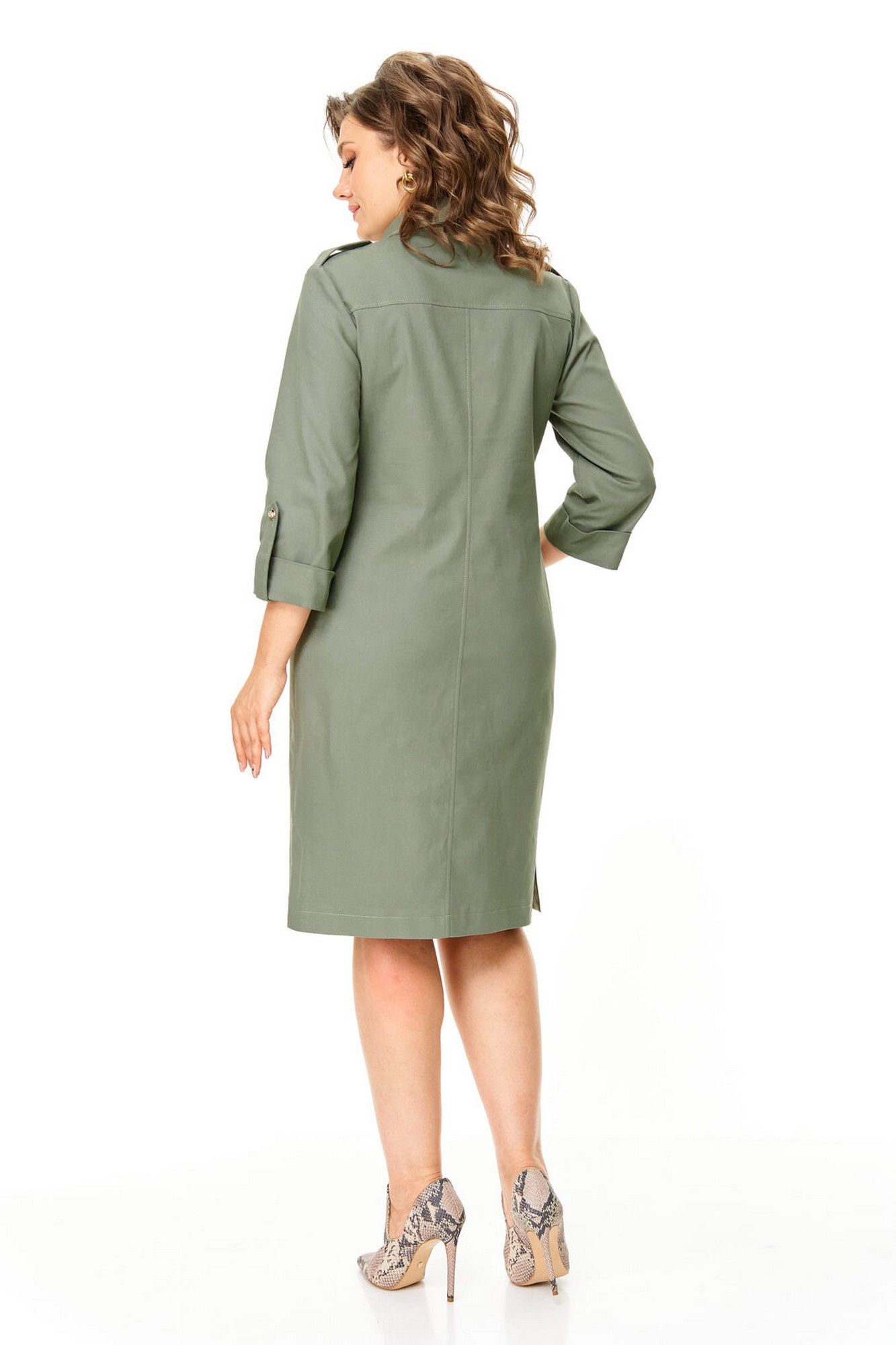 Платье прямого силуэта с естественной линией плеча.Спинка со средним швом и кокеткой.Перед с нагрудными вытачками, накладными карманами и клапанами.По переду обработана отделочная отрезная планка с застежкой на петли-пуговицы.Рукав втачной одношовный длиной 3/4 с отделочной манжетой и патой по низу.На плечевых швах имеются отделочные паты с пуговицами.В боковых швах выполнены невысокие разрезы.На правой стороне переда, по низу, пришита декоративная нашивка.Отделочные строчки контрастного цвета.Вся фурнитура металлическая premium качества.