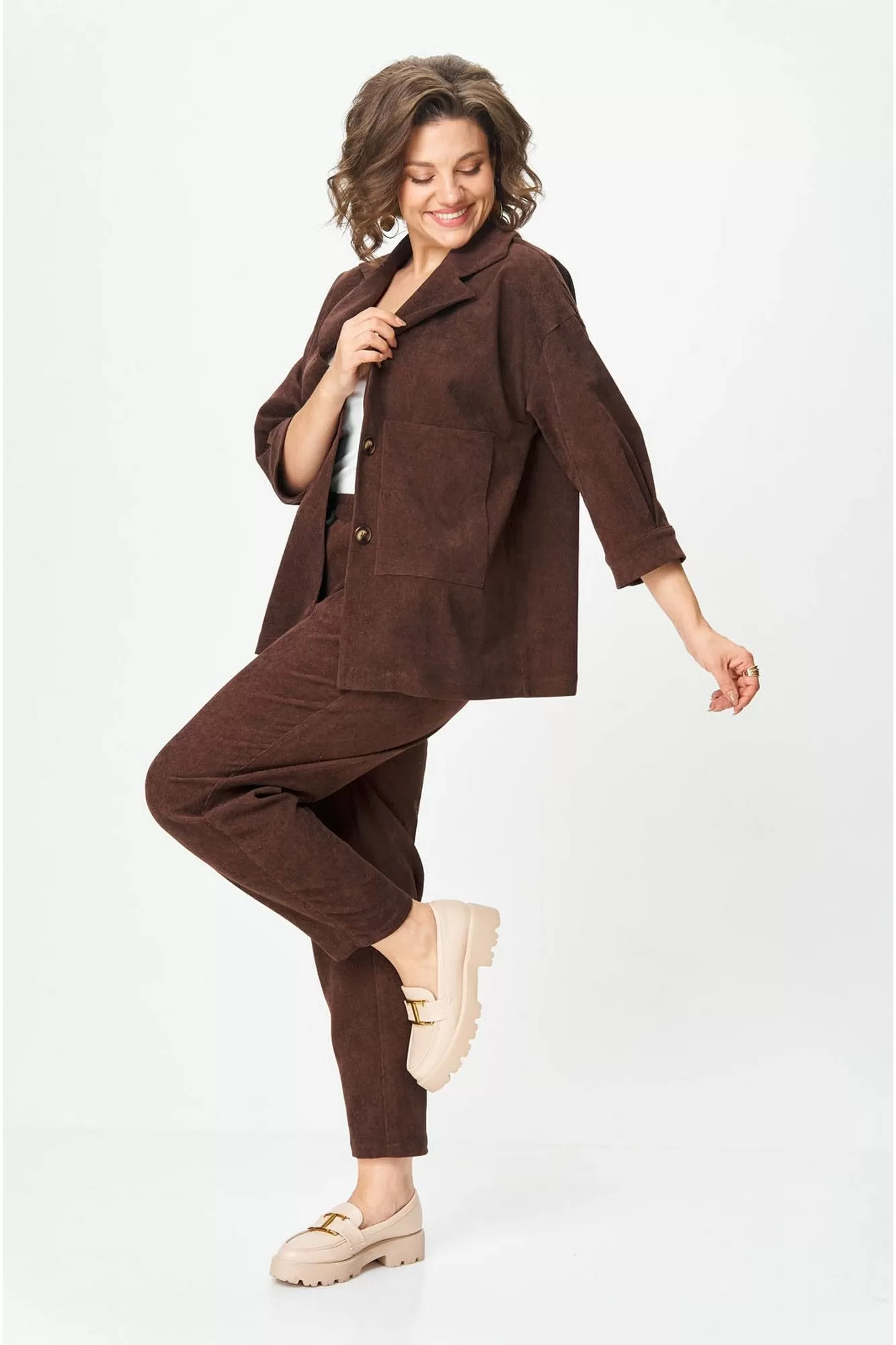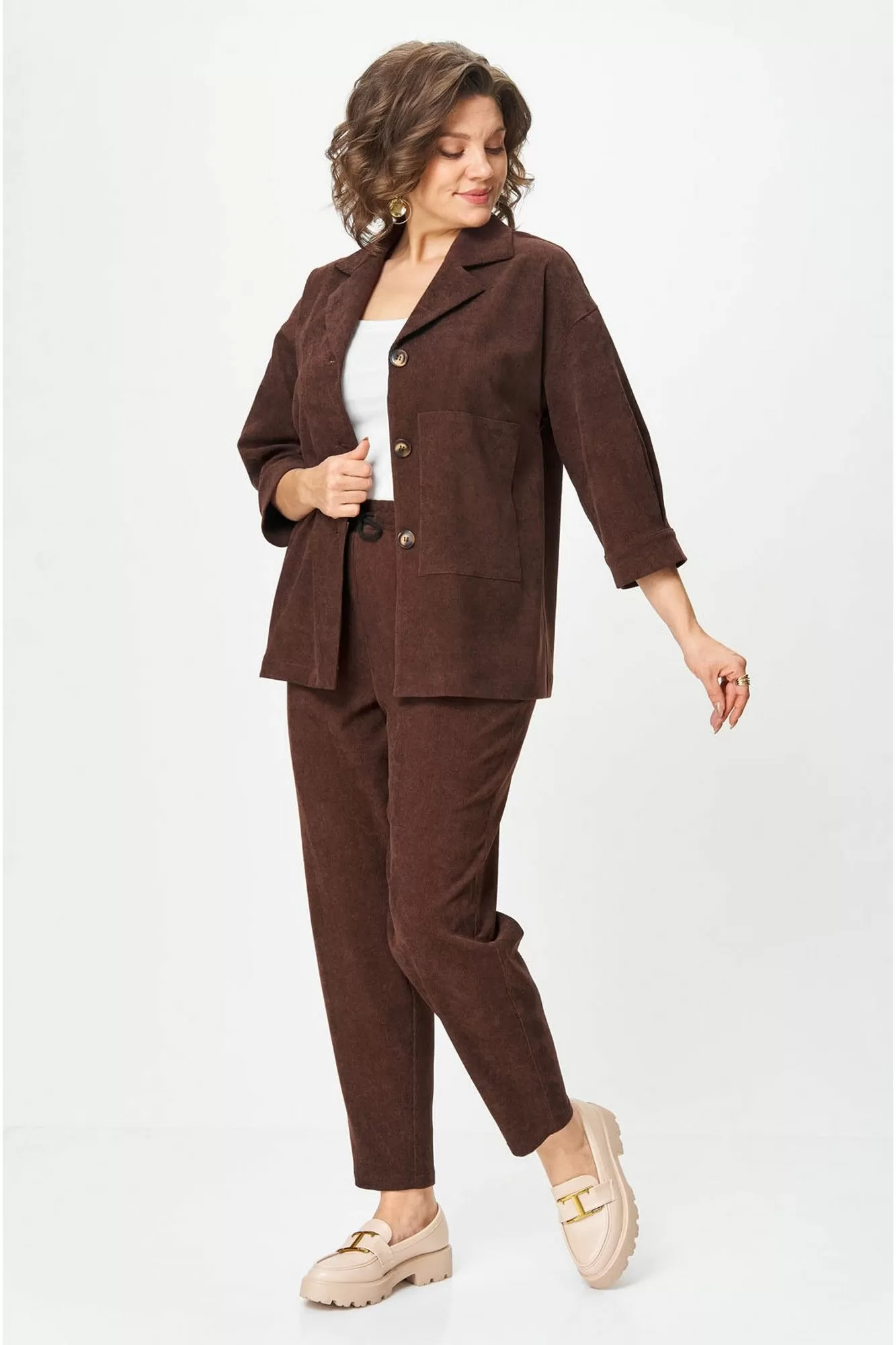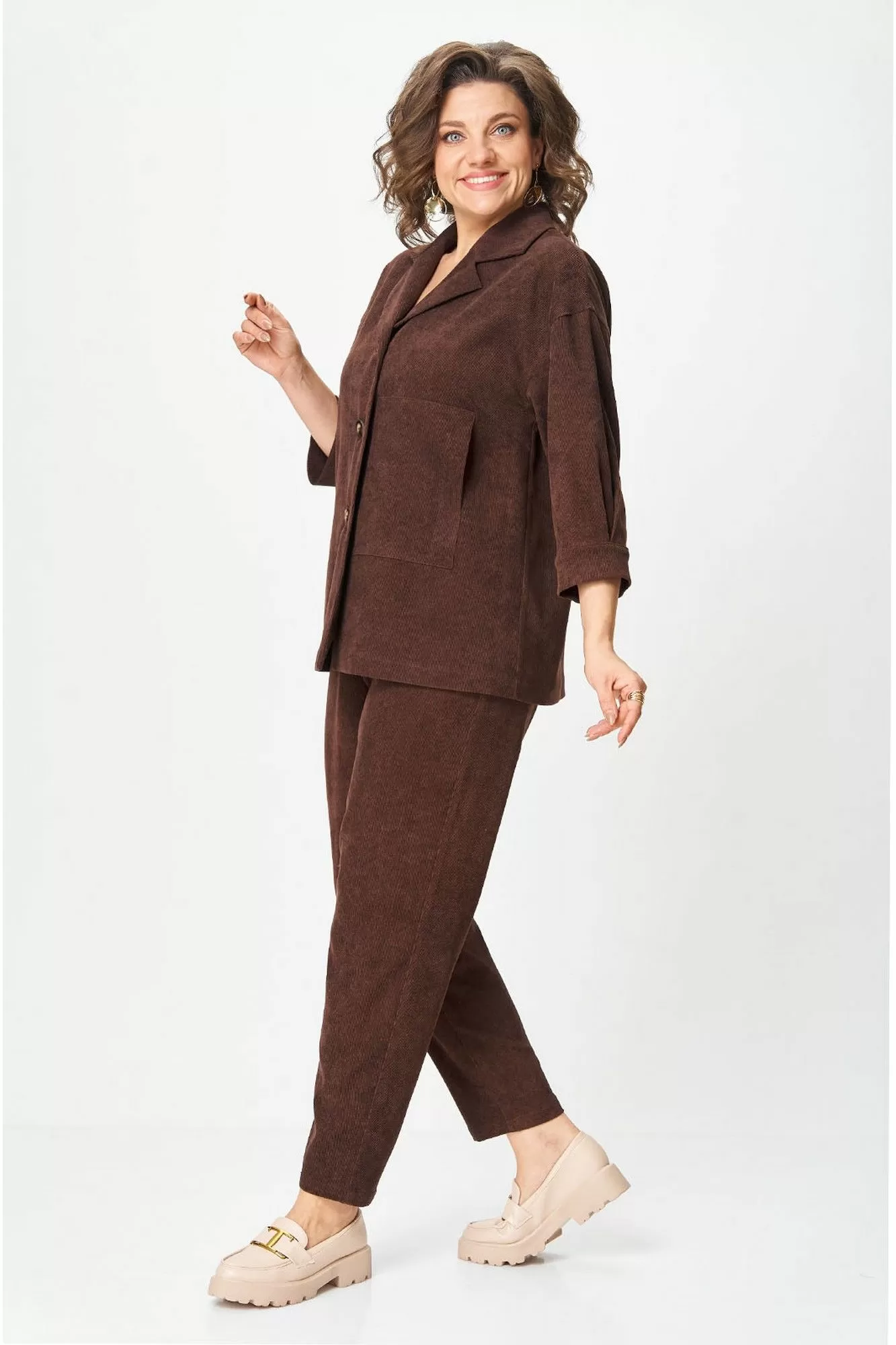 Жакет классический из ткани вельвет без подкладки. Воротник пиджачного типа, рукав спущенный низ рукава с встречной складкой обработан манжетом. Застежка на петли пуговицы, на полочке накладной карман. Брюки: Верхний срез брюк обработан поясом в пояс вставлена резинка и шнур для регулировки . В боковых швах брюк карманы.