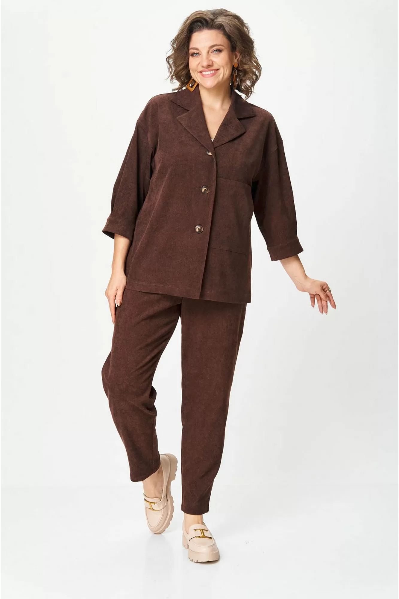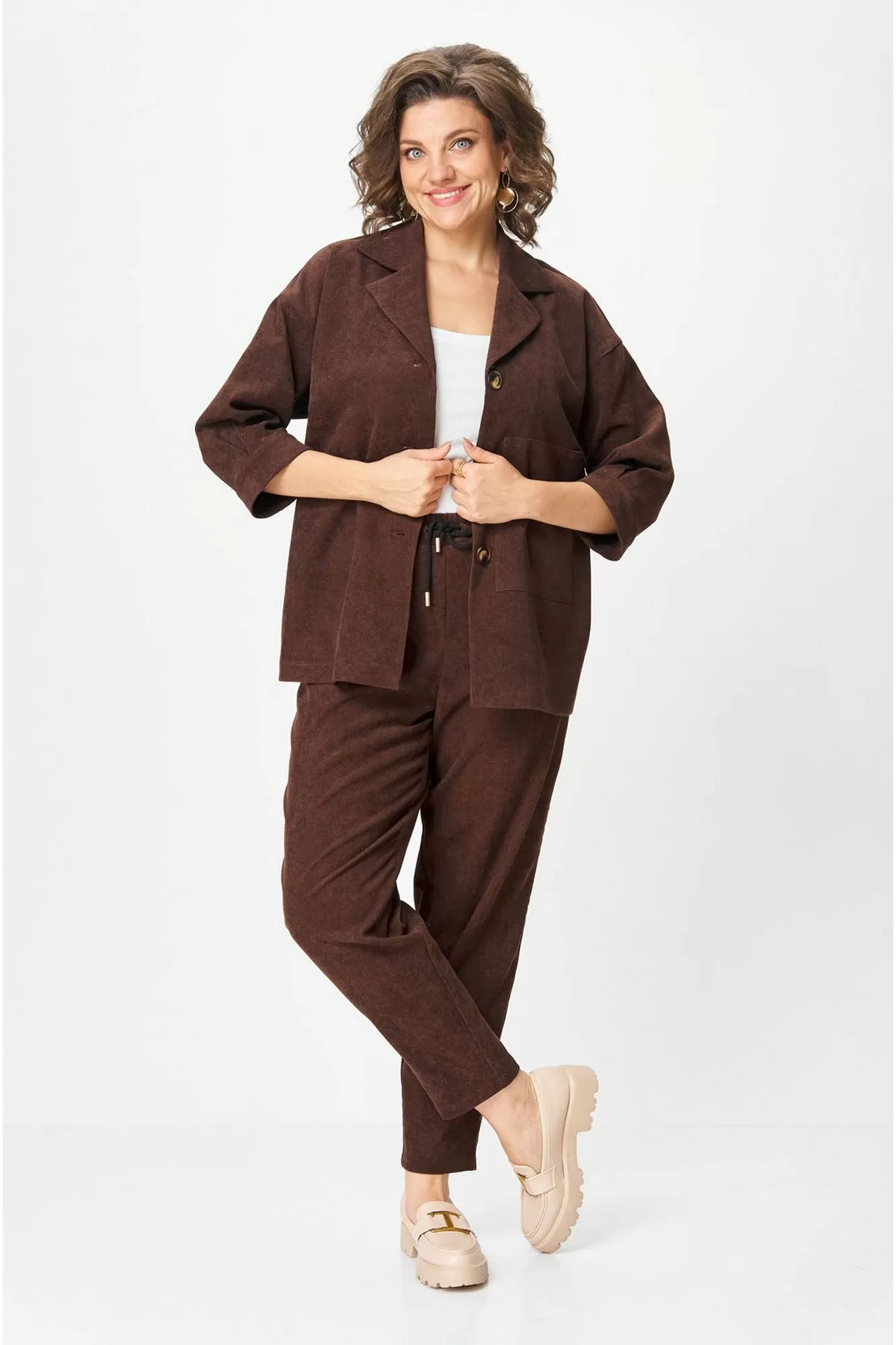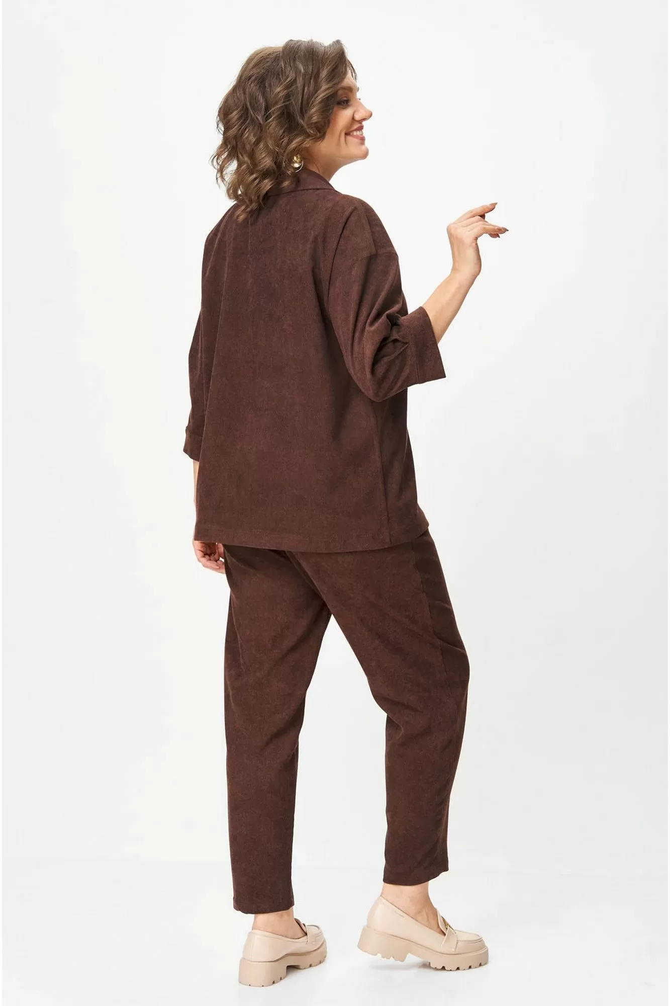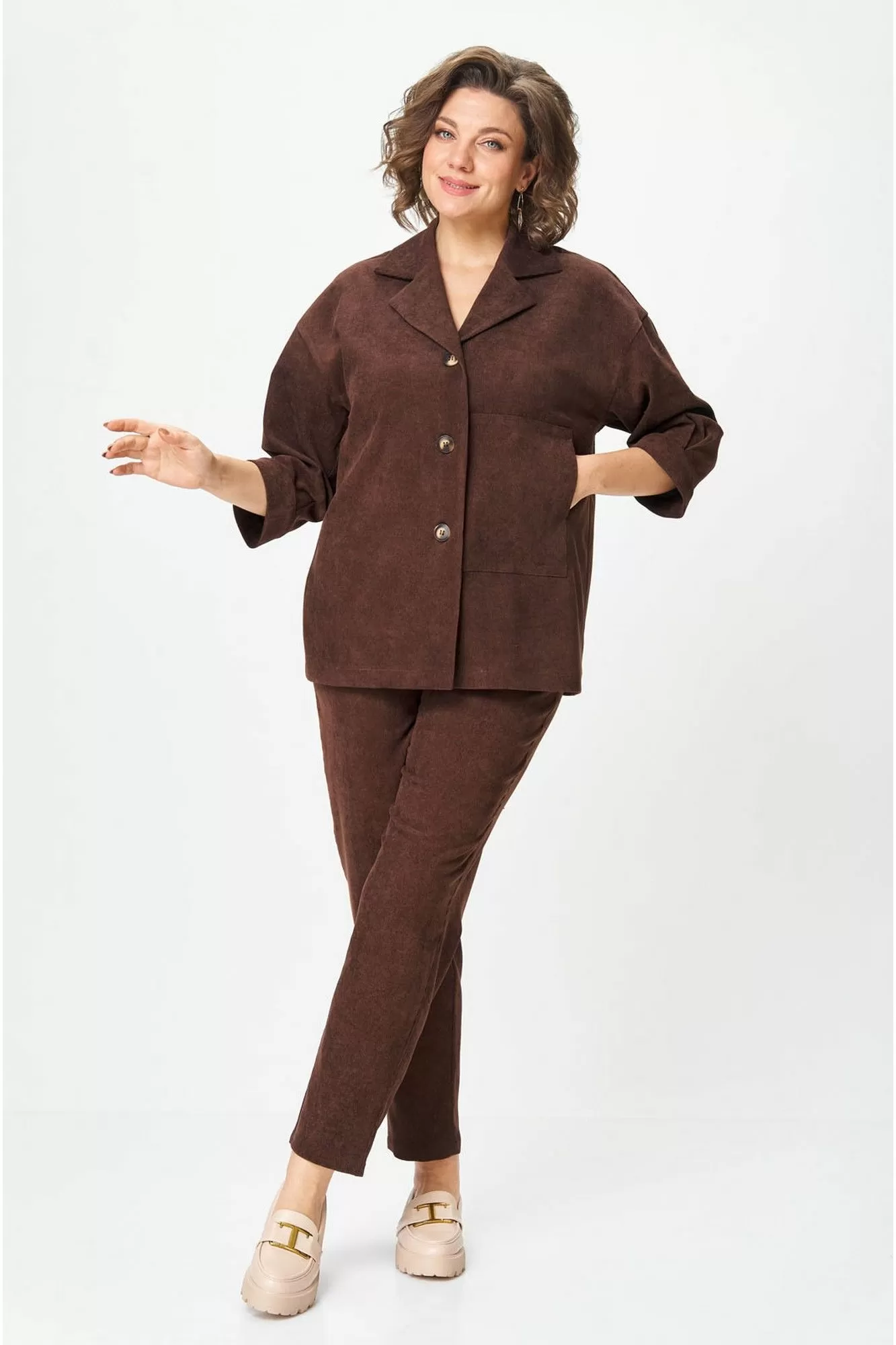 Жакет классический из ткани вельвет без подкладки. Воротник пиджачного типа, рукав спущенный низ рукава с встречной складкой обработан манжетом. Застежка на петли пуговицы, на полочке накладной карман. Брюки: Верхний срез брюк обработан поясом в пояс вставлена резинка и шнур для регулировки . В боковых швах брюк карманы.
