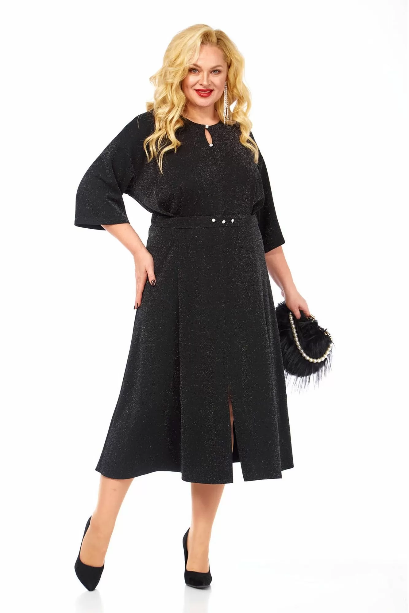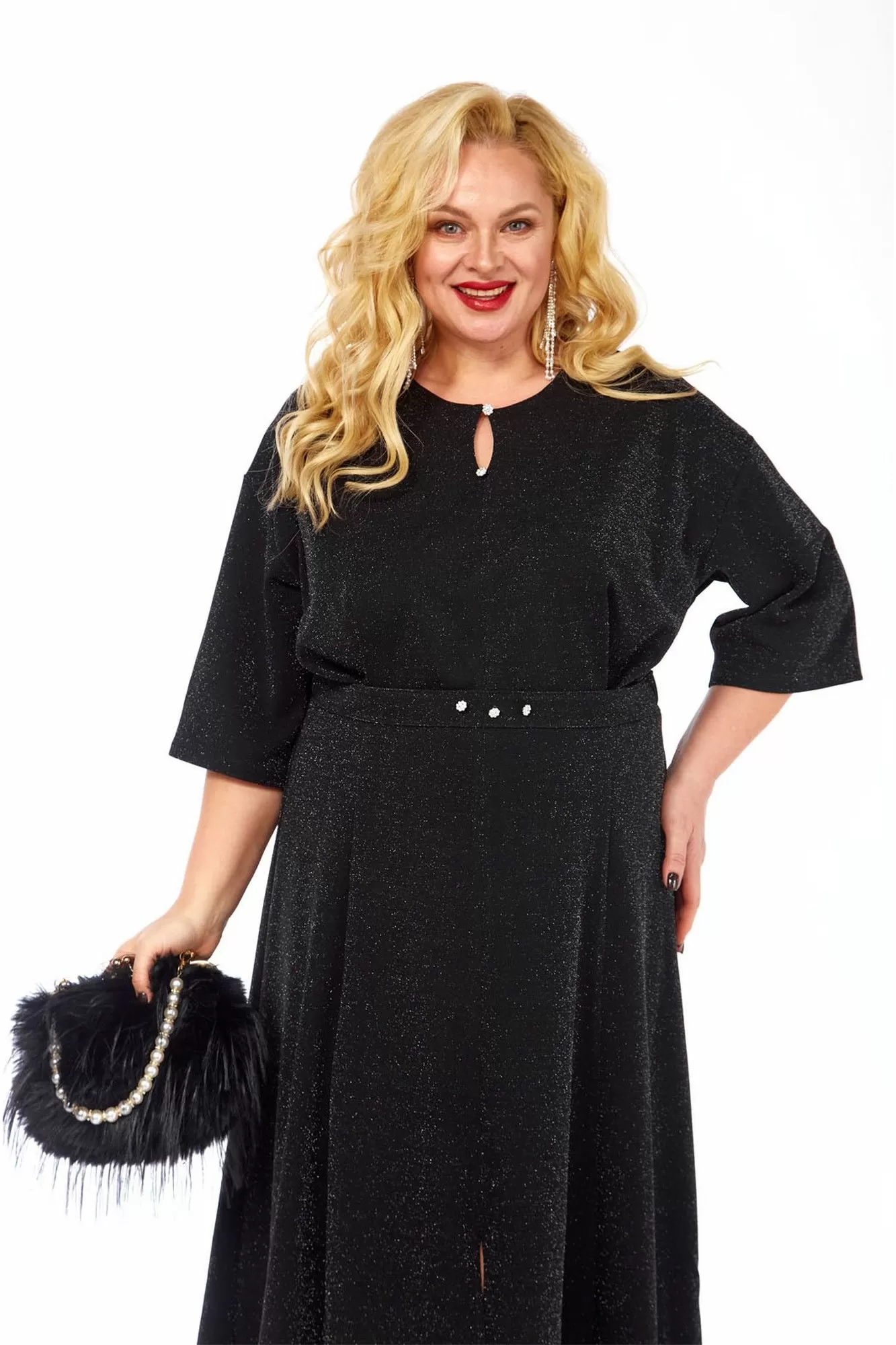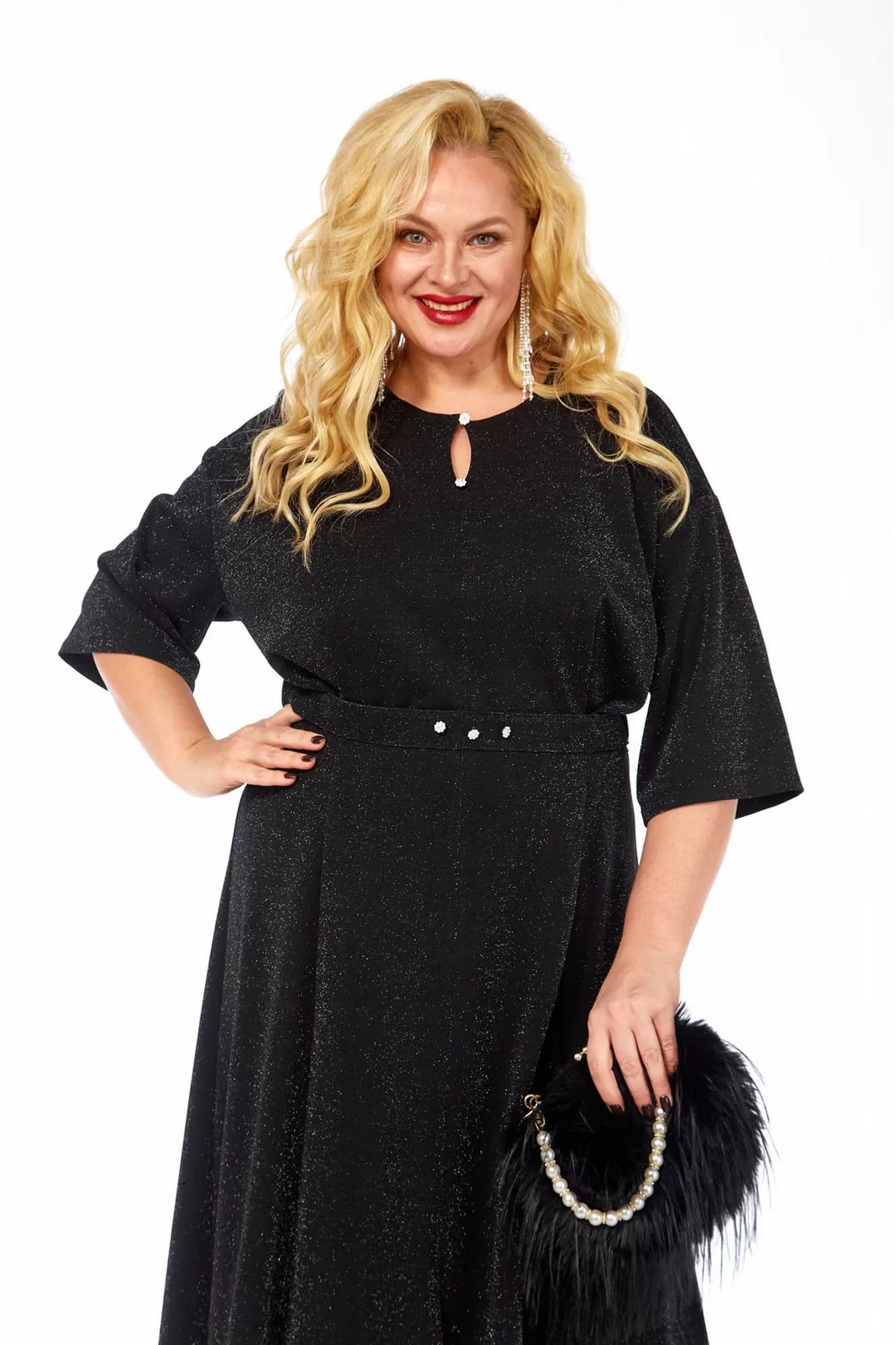Эффектное женское платье расширенного силуэта к низу из ткани с нежной блестящей нитью. По переду платья в области талии заложены складки, круглая горловина с переходом в капельку обработана обтачкой , по капельке пришиты отделочные пуговицы, верхняя пуговица расстегивается. По задней половинке платья средний шов в шов вставлена молния. Низ платья слегка расширенный к низу. Рукав спущенный. Пояс съемный застегивается на пуговицу сзади, спереди пояса пришиты отделочные пуговицы.