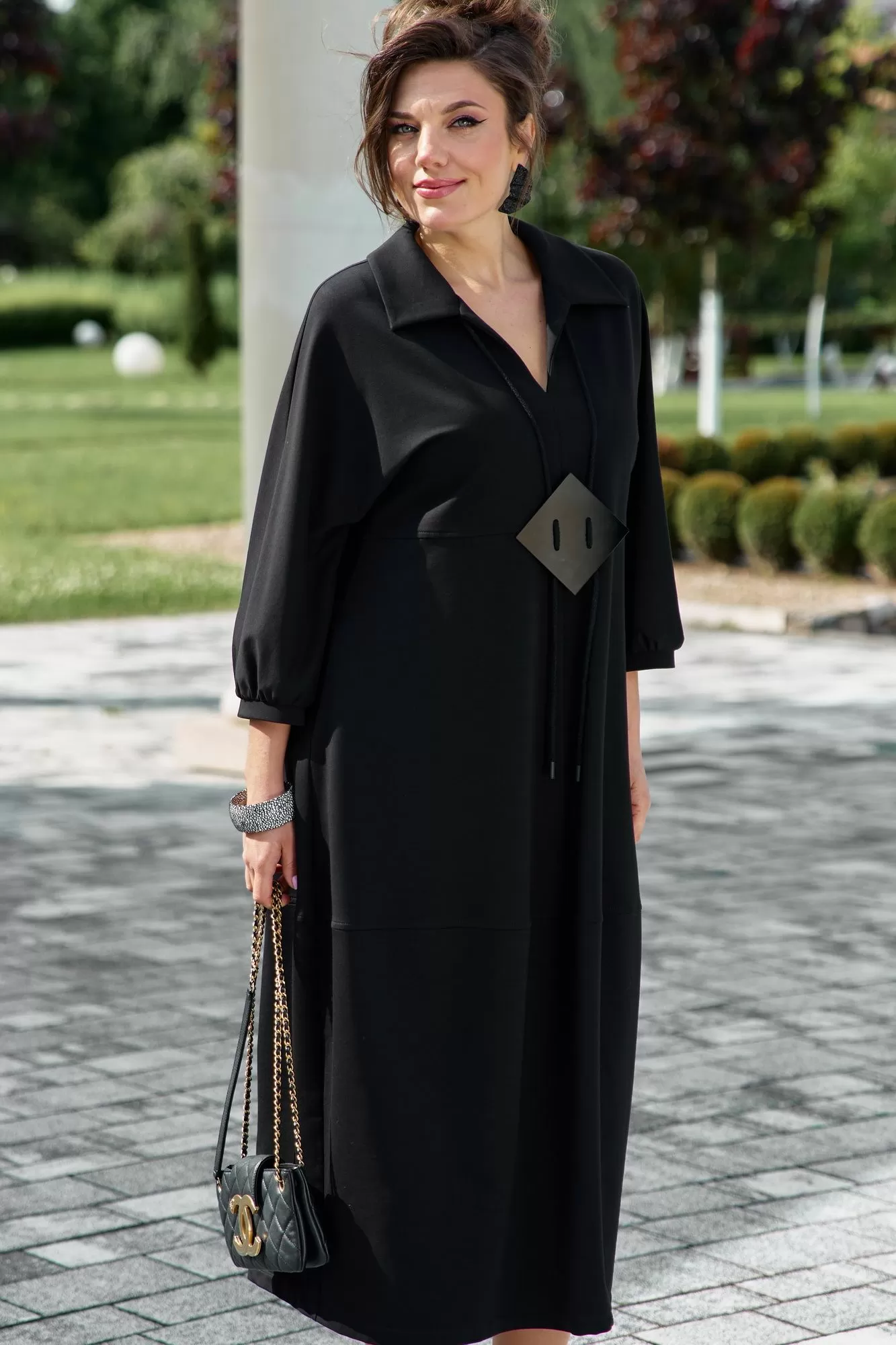 Представляем вашему вниманию элегантное платье миди в насыщенном чёрном оттенке, который актуален в любом сезоне. Выполненное из мягкой, струящейся ткани, оно обеспечивает приятные ощущения при носке и безупречную посадку. Свободный крой платья напоминающий собой форму «купола» слегка заужается к низу придает силуэту изящество и позволяет ему деликатно ниспадать по фигуре. V-образный вырез горловины, дополненный отложным воротником, придает платью классический и в то же время современный вид. Линия талии завышенная, лиф платья двойной, со средним швом. Рукав в платье цельнокроеный со сборкой на манжету, добавляют образу непринужденности и объема. Горизонтальный шов, расположенный примерно на уровне бедер, создает интересный структурный акцент. В боковых швах карманы. В качестве дополнительного декоративного элемента в комплекте с платьем идёт украшение ручной работы. Длина платья 125 см., длина рукава 62,5 см (р 52-56), 64,5 см (р 58-62).