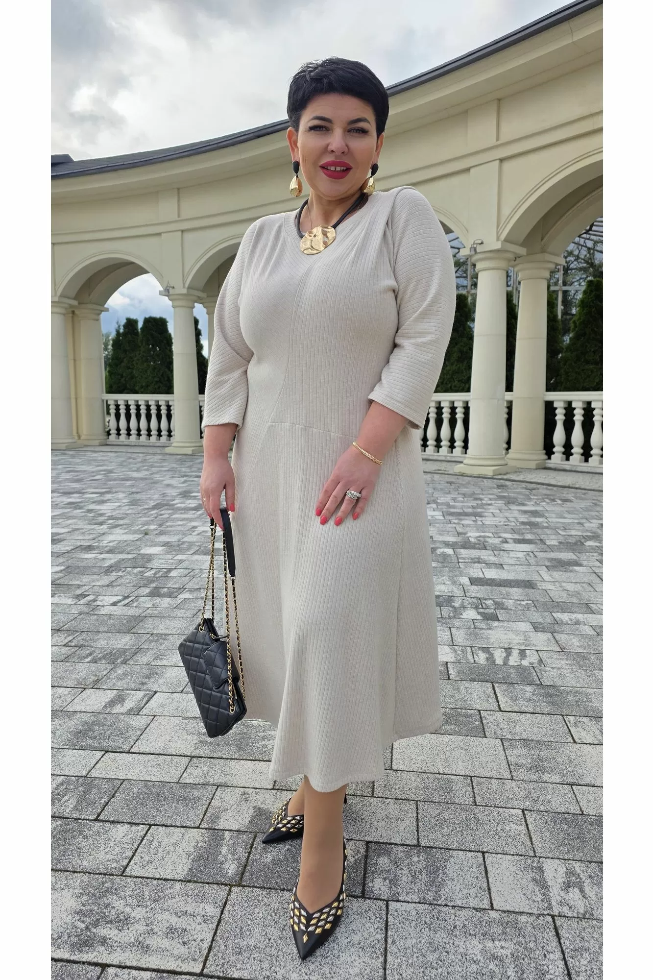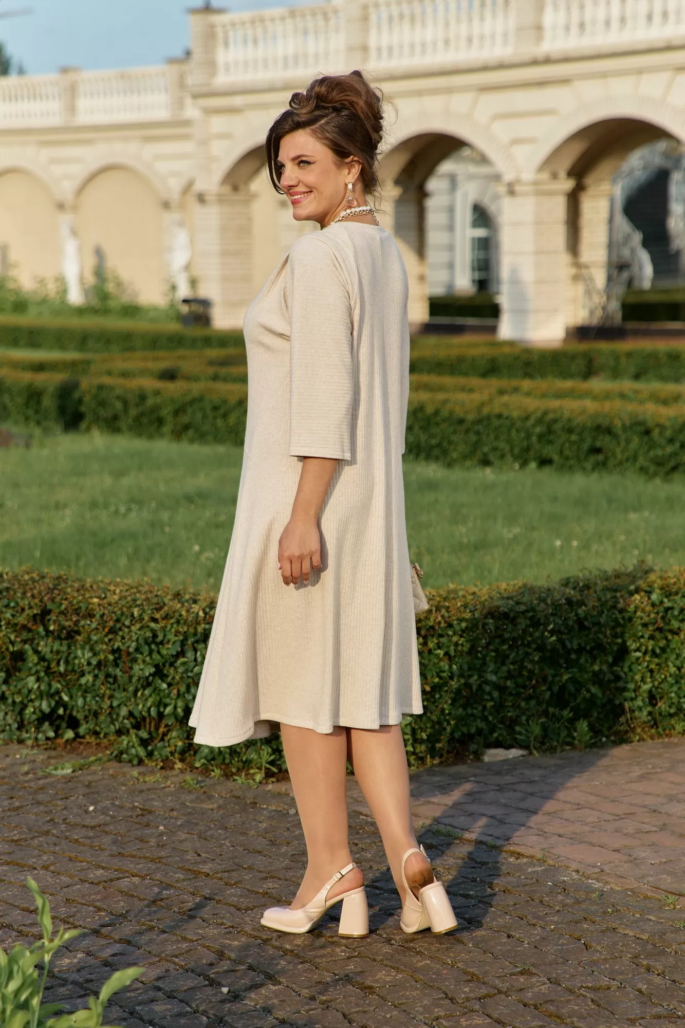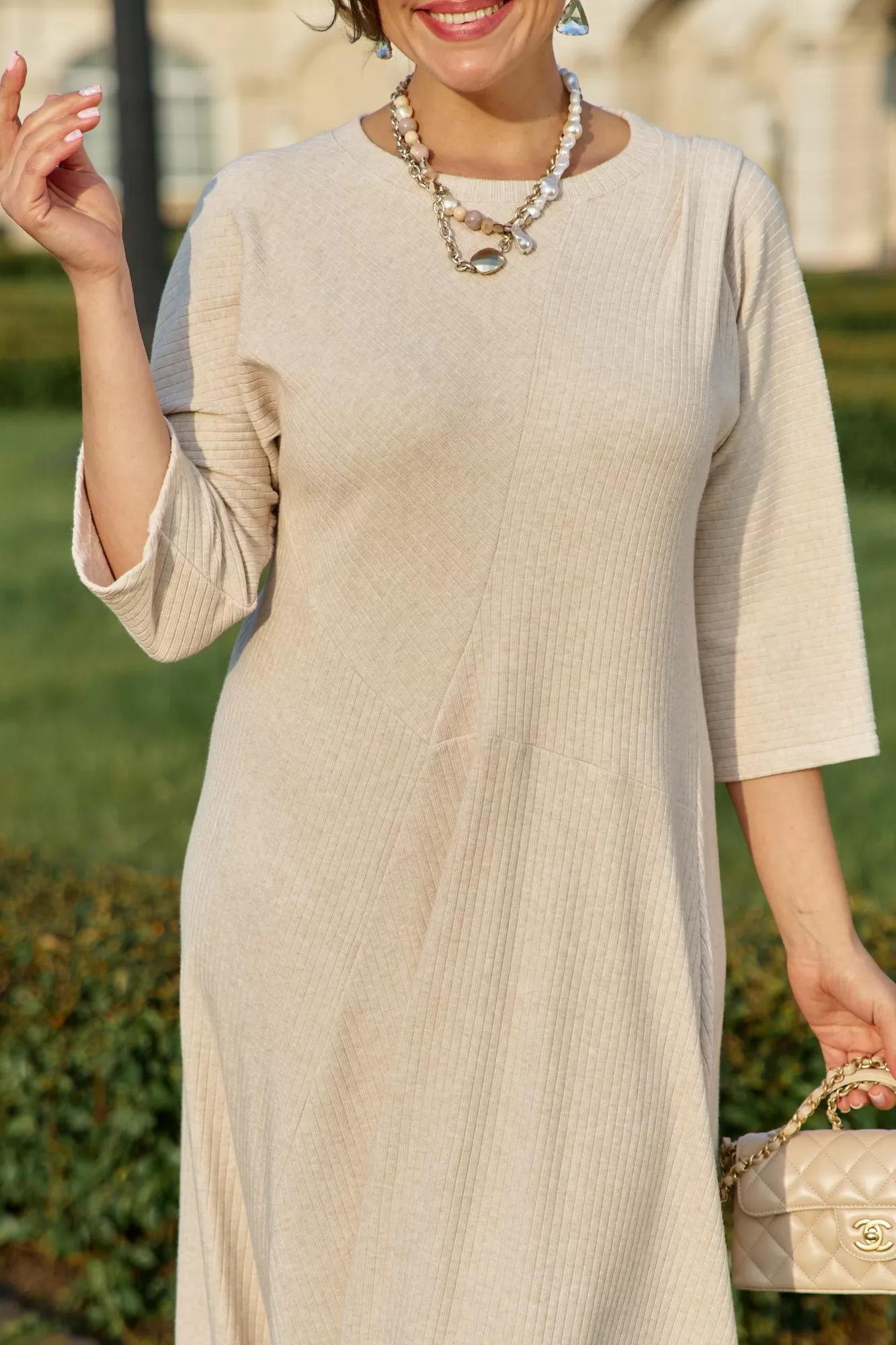 Платье выполнено из высококачественного трикотажа в рубчик, известного как "лапша", это платье обеспечивает приятные тактильные ощущения и отличную посадку по фигуре. Силуэт "клеш" от талии деликатно ниспадает, создавая летящую, женственную форму, которая подчеркивает достоинства фигуры и дарит свободу движений. Горловина округлой формы, оформлена бейкой. По переду платья фигурные подрезы, позволяющие полоске в платье ложиться в разных направлениях создавая интересный образ; у плеча декоративная заложенная складка. Рукав в платье цельнокроеный. Длина миди и рукава три четверти придают платью утонченный и завершенный вид. Длина платья 119 см, длина рукава 52 см.