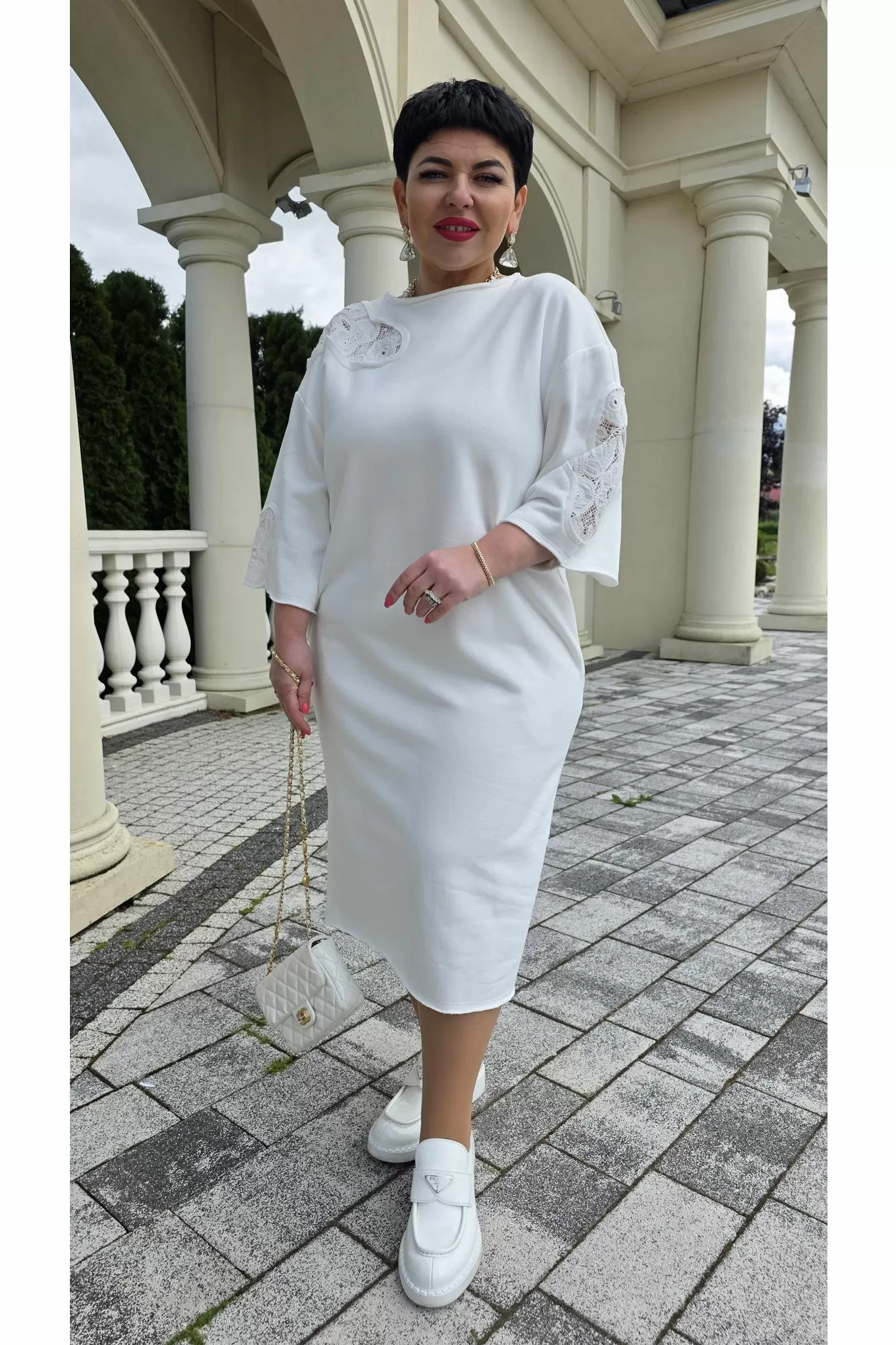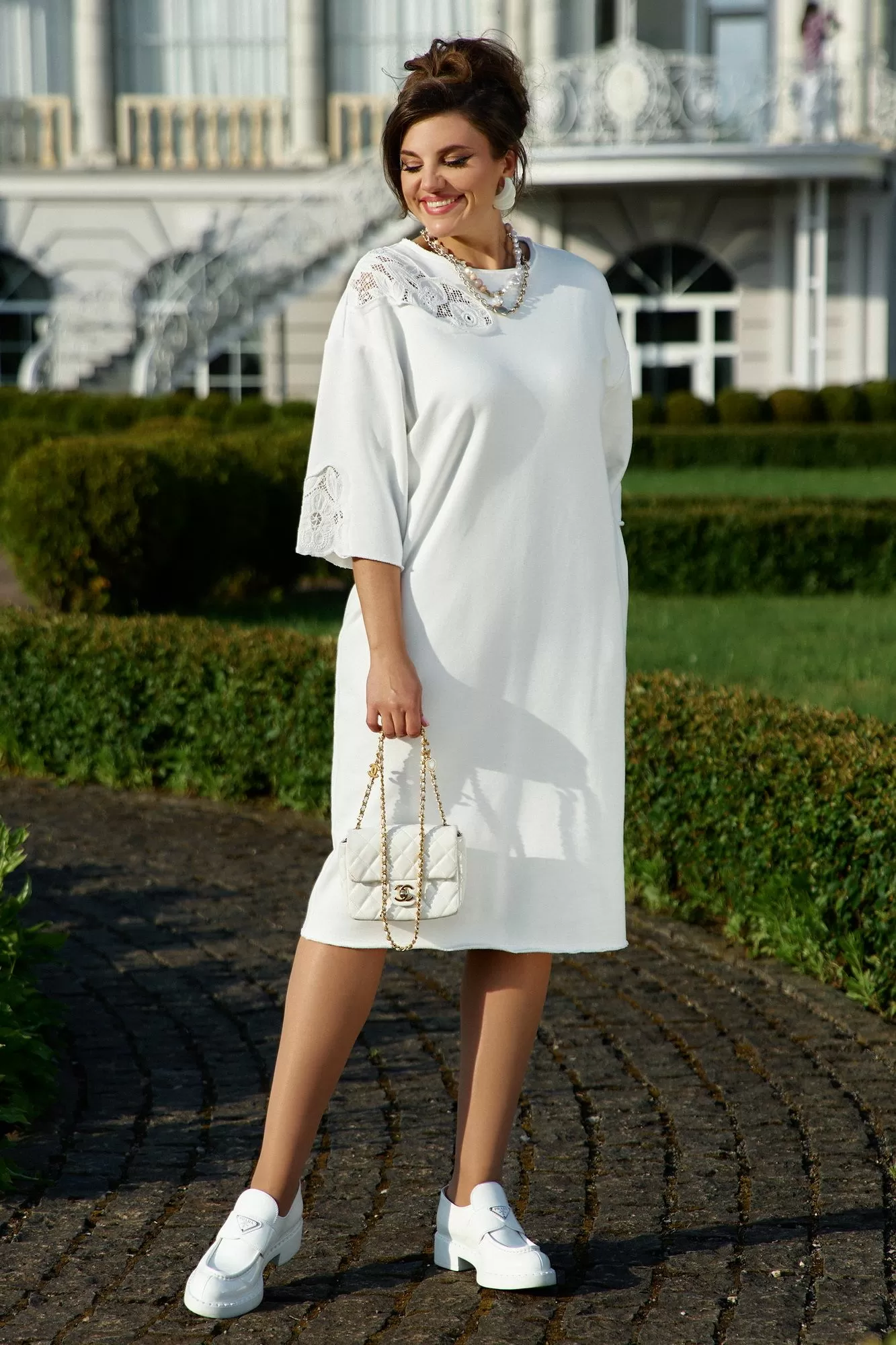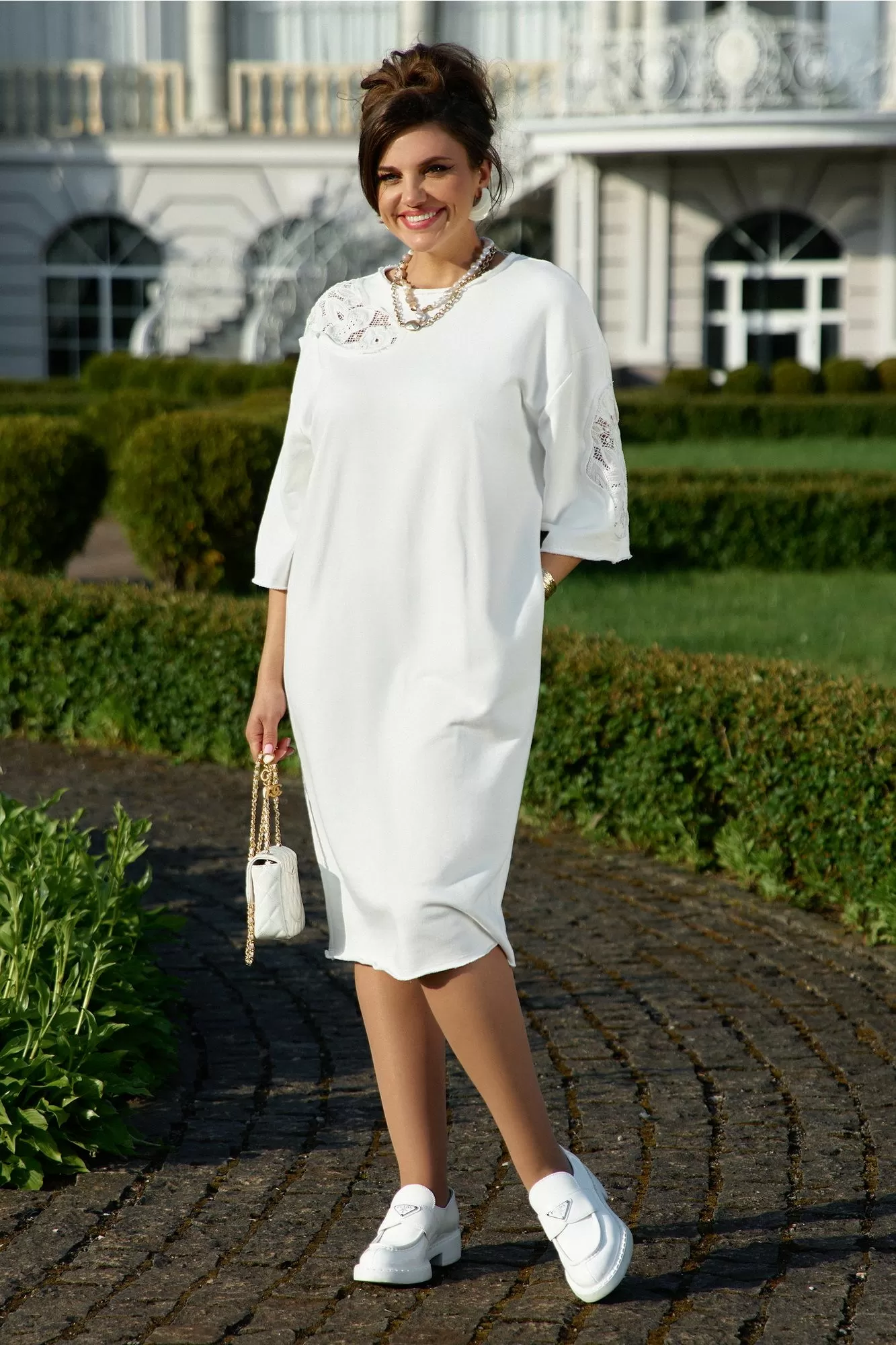 Если Вы ищете идеальное сочетание стиля и комфорта, вот идеальный выбор. Мы специально подобрали качественную и тактильно приятную ткань, которая хорошо держит свою форму, создавая ощущение легкости и свободы движения. Отделочные вставки из вышитого ришелье в тон добавляют образу романтичные нотки. Платье свободного силуэта с округлой формой горловины, линия плеча спущенная. По переду платья декоративная вставка из отделочного материала- вышивки ришелье. Спинка в платье с средним швом. Рукав втачной, длиной 7/8. В качестве дополнительного декоративного элемента в рукавах ассиметричные вставки из ришелье. Главной особенностью в изделии является эффект необработанных срезов, который добавляет образу дерзости. Длина платья по спине 107 см (р 50-54), 109 см (р 56-60), длина рукава 32 см.