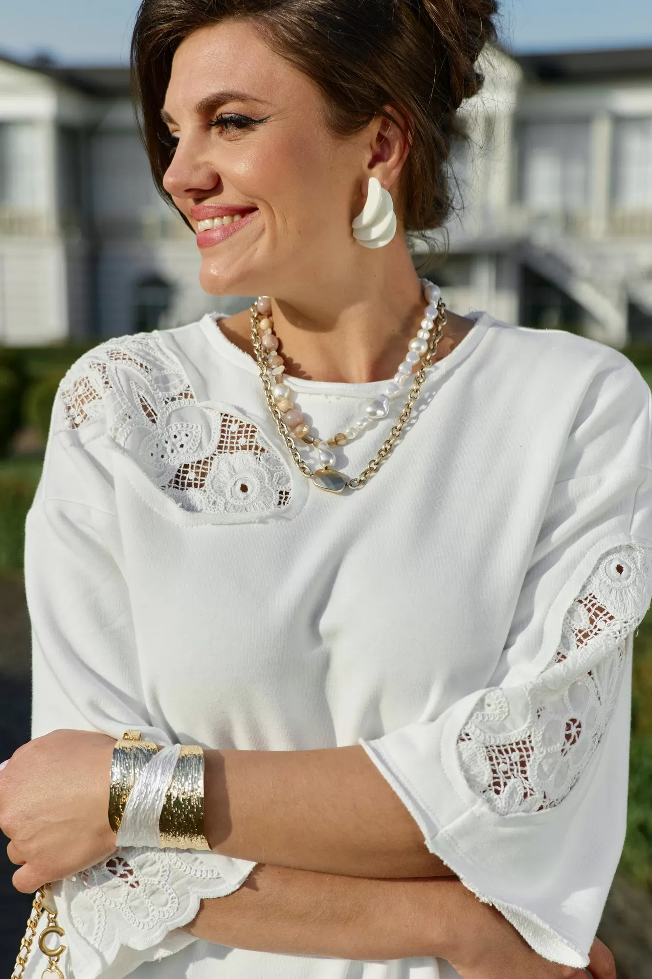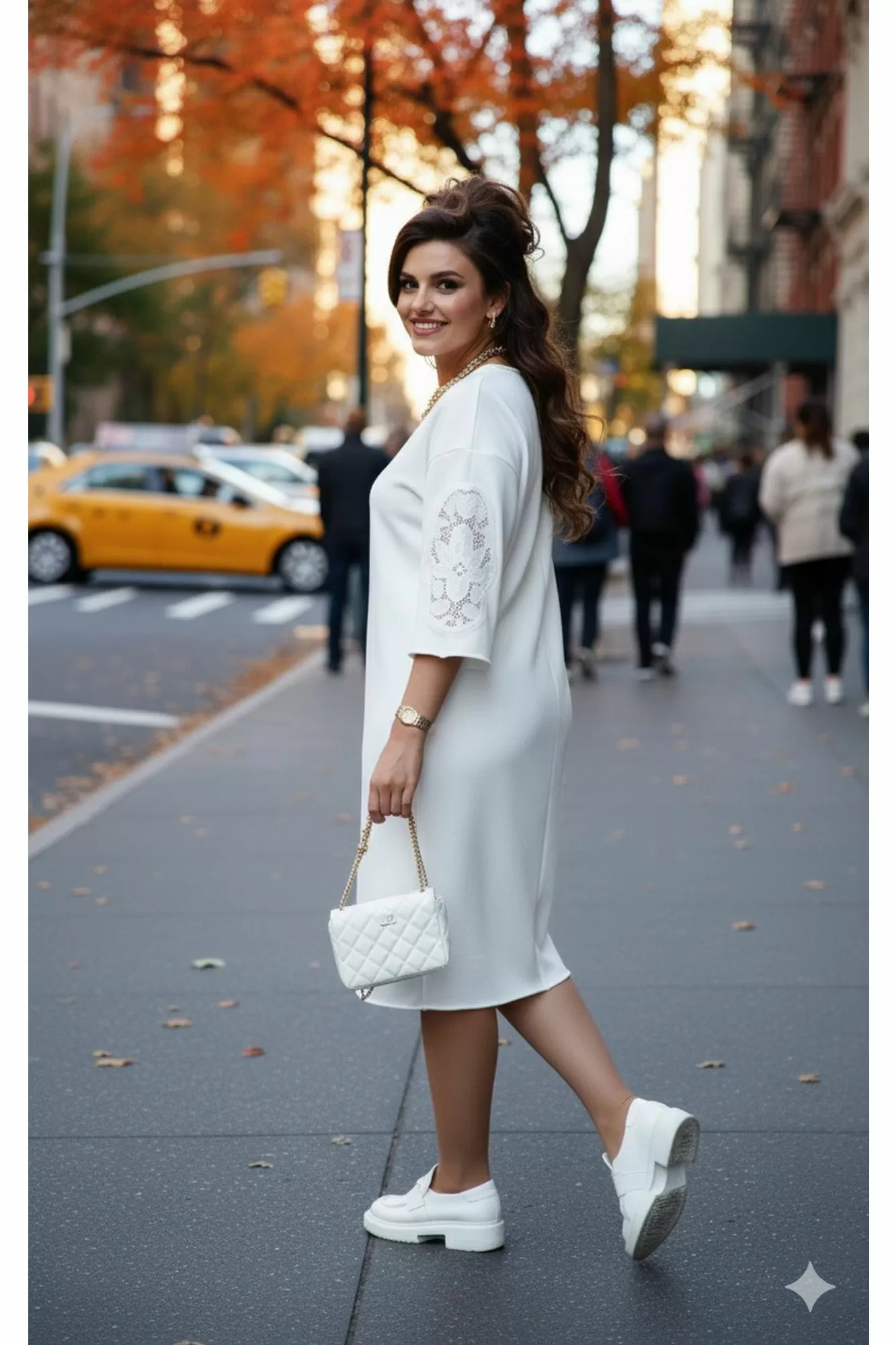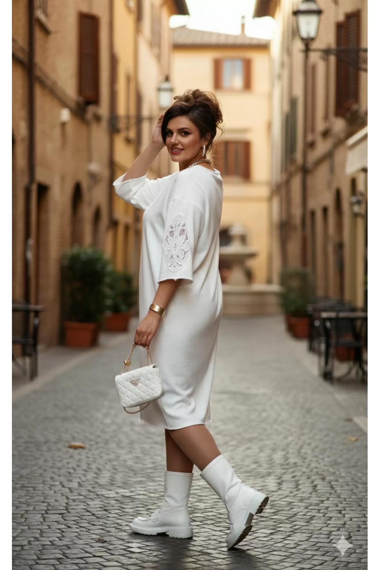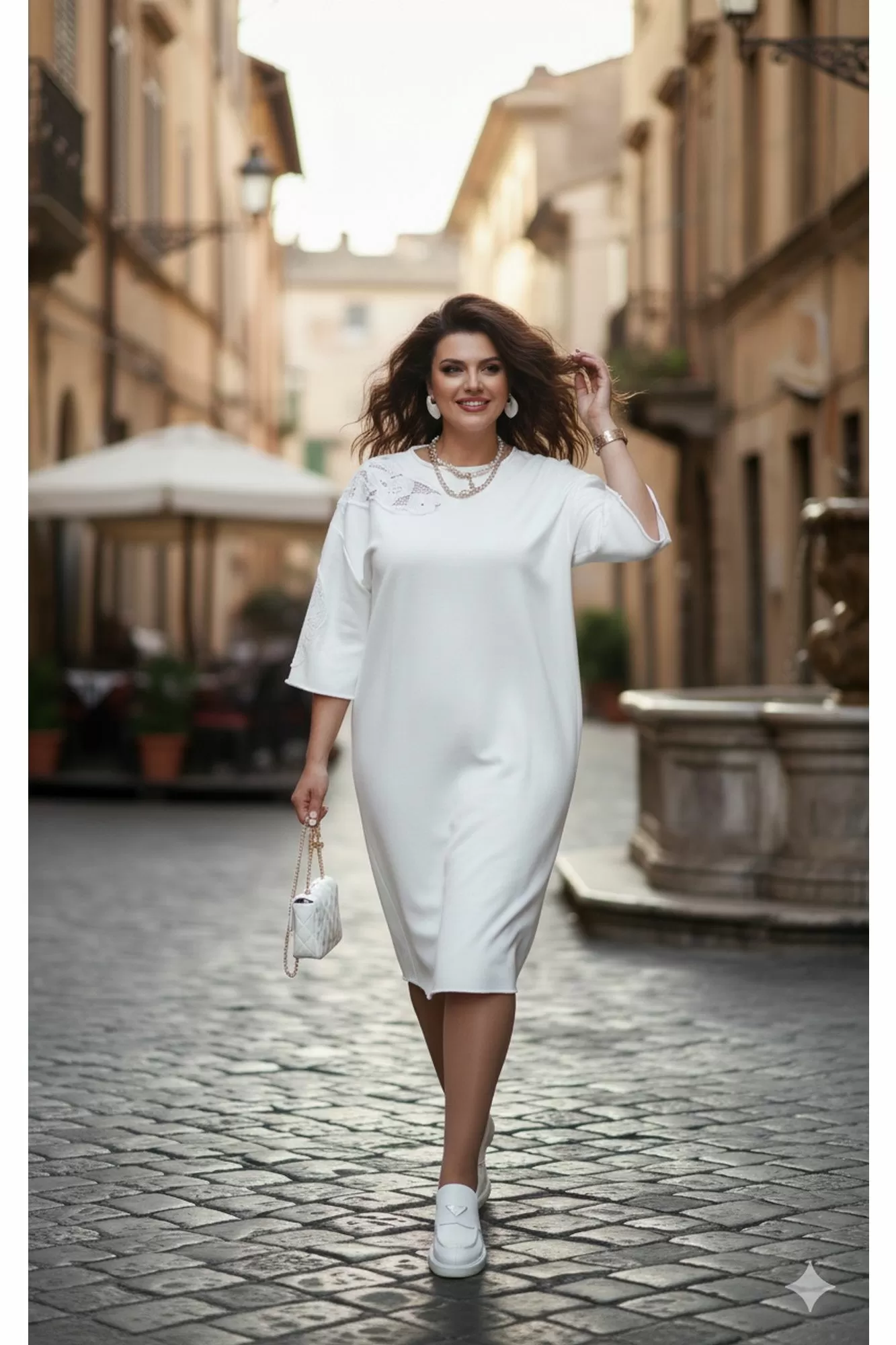 Если Вы ищете идеальное сочетание стиля и комфорта, вот идеальный выбор. Мы специально подобрали качественную и тактильно приятную ткань, которая хорошо держит свою форму, создавая ощущение легкости и свободы движения. Отделочные вставки из вышитого ришелье в тон добавляют образу романтичные нотки. Платье свободного силуэта с округлой формой горловины, линия плеча спущенная. По переду платья декоративная вставка из отделочного материала- вышивки ришелье. Спинка в платье с средним швом. Рукав втачной, длиной 7/8. В качестве дополнительного декоративного элемента в рукавах ассиметричные вставки из ришелье. Главной особенностью в изделии является эффект необработанных срезов, который добавляет образу дерзости. Длина платья по спине 107 см (р 50-54), 109 см (р 56-60), длина рукава 32 см.
