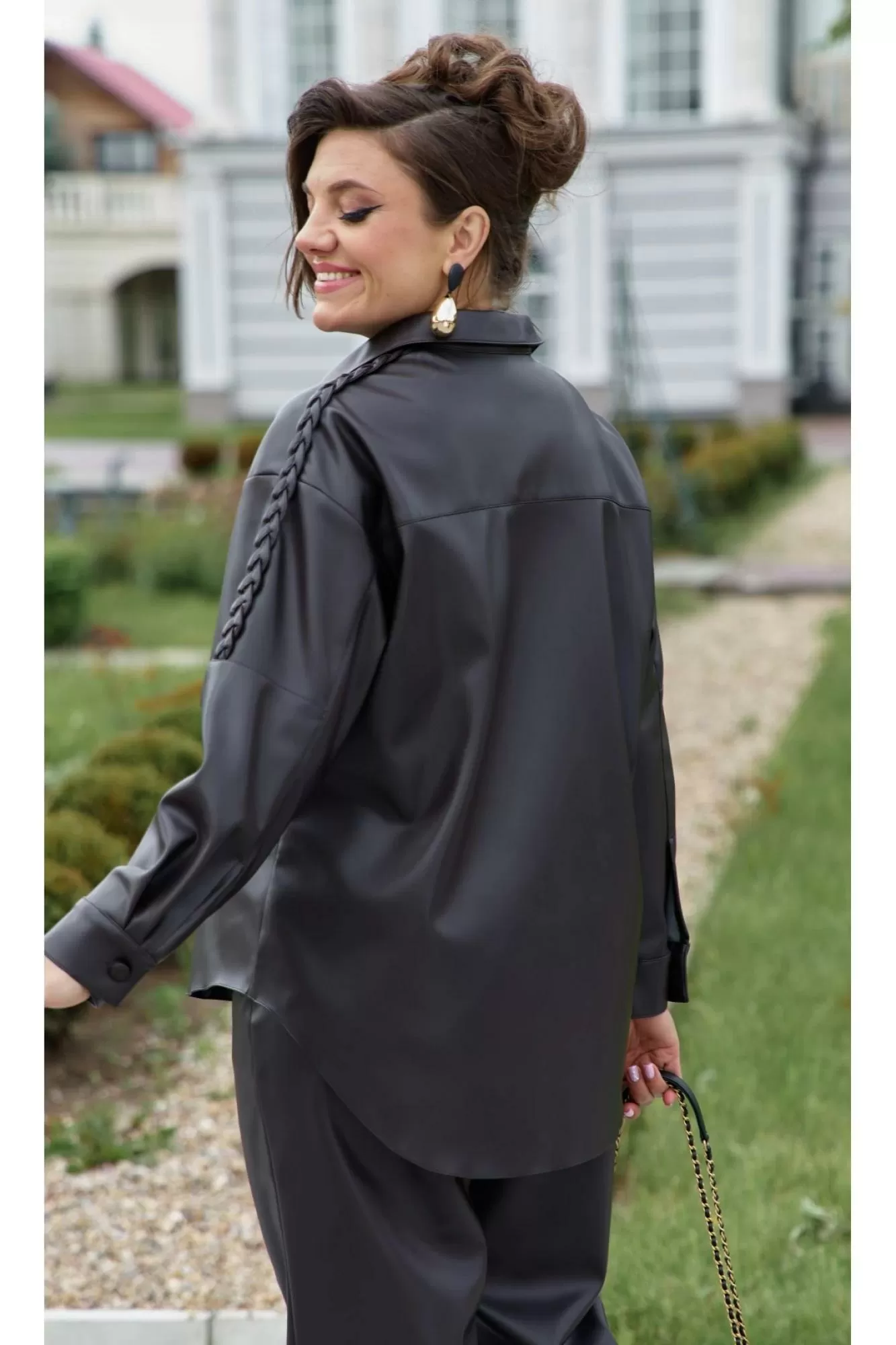 Рубашка— не просто верх, а главный акцент. Кожа, плотная, но податливая, образует «оверсайз» силуэт. Плечо, от места втачивания воротника и до вытачки по рукаву, украшены декоративными косичками из кожаных тесёмок. По переду рубашки застёжка на декоративные пуговицы в тон ткани по планке, и накладные карманы. Воротник рубашечного типа. Линия плеча спущенная. Спинка в рубашке с отрезной кокеткой. Рукав втачной, длинный с локтевым швом и разрезом от низа; заложенной складкой от низа и притачной манжетой. Низ в рубашке ассиметричный. Длина рубашки по спинке 81 см. Длина рукава рубашки 52 см.