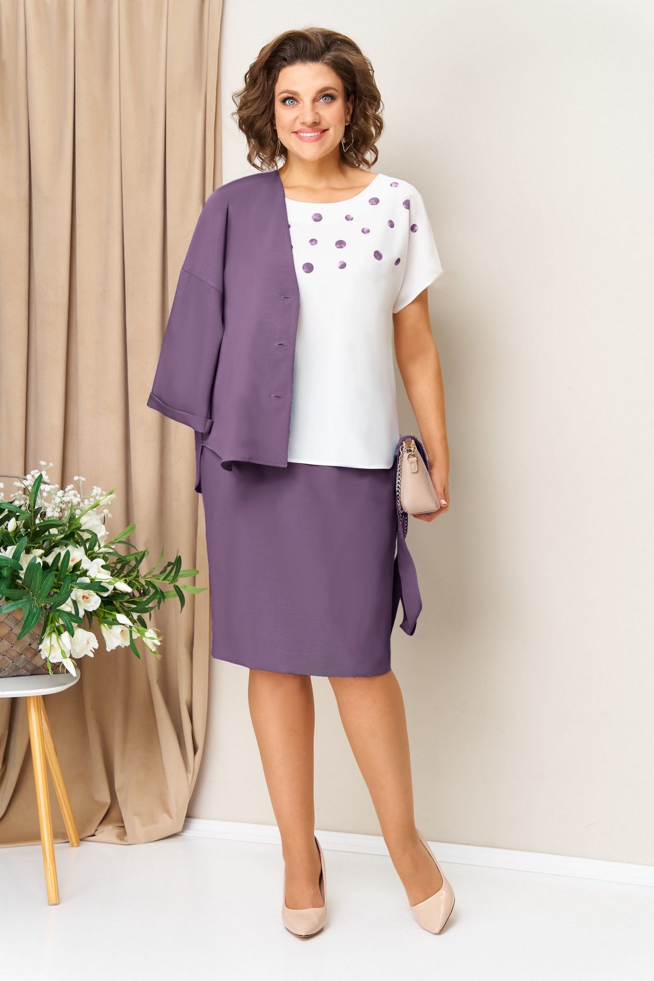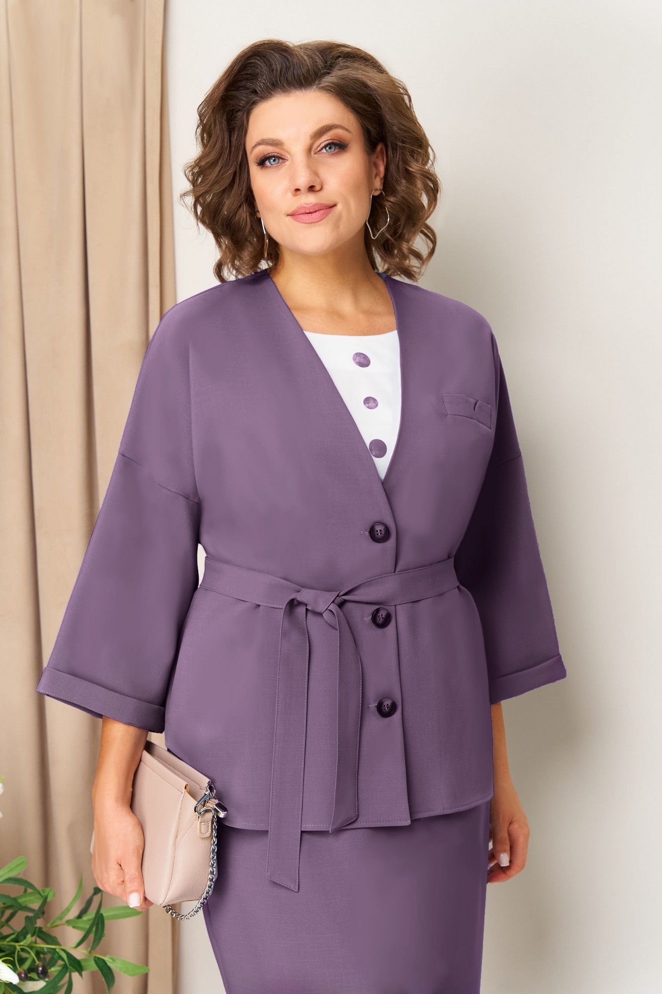 Жакет с V-образной горловиной, прямого силуэта, без подкладки, с застежкой на пуговицы Длина жакета по центру спинки- 68см. Прямая юбка со шлицей. Длина юбки - 63см. Блуза из легкого текстиля со спущенным коротким рукавом. Длина блузы по центру спинки-60см. Пояс в комплекте изделия.