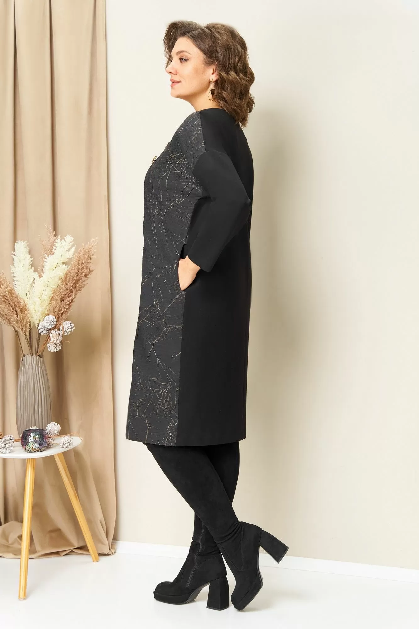 Эффектное платье полуприлегающего силуэта, сочетающая в себе лаконичность и элегантность классического футляра с современным и стильным декором. Вертикальная вставка добавляет модели архитектурной четкости, , а декоративные пуговицы служат изящной деталью. Горловина платья выполнена в форме "лодочка". Для удобства в боковых швах плятья есть потайные карманы. Рукав слегка спущенный, 7/8. Длина платья- 102 см по центру спинки.