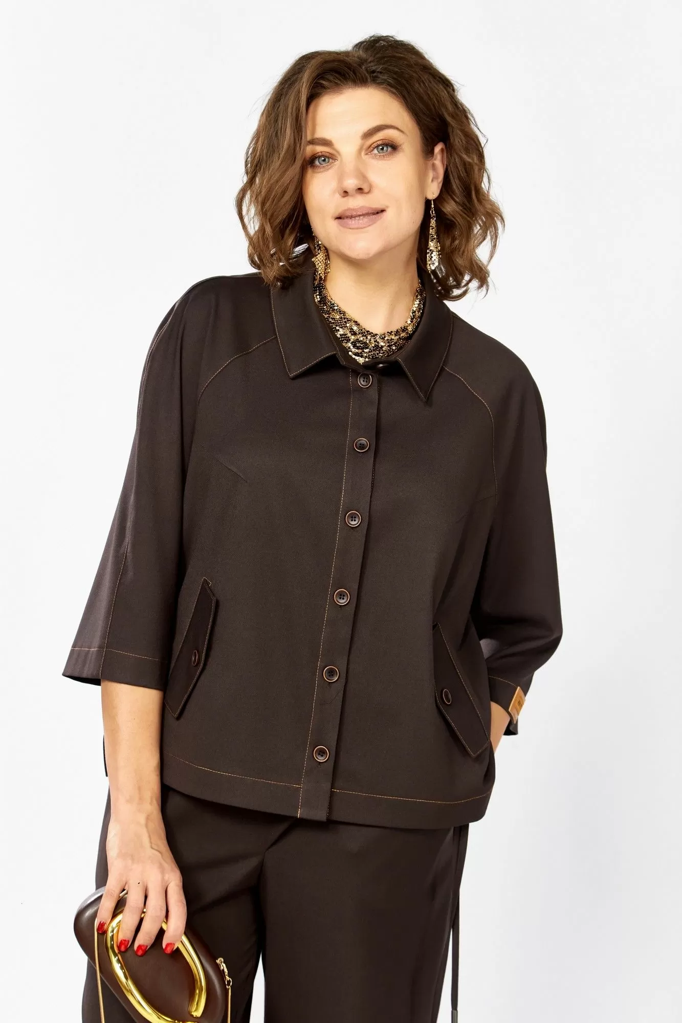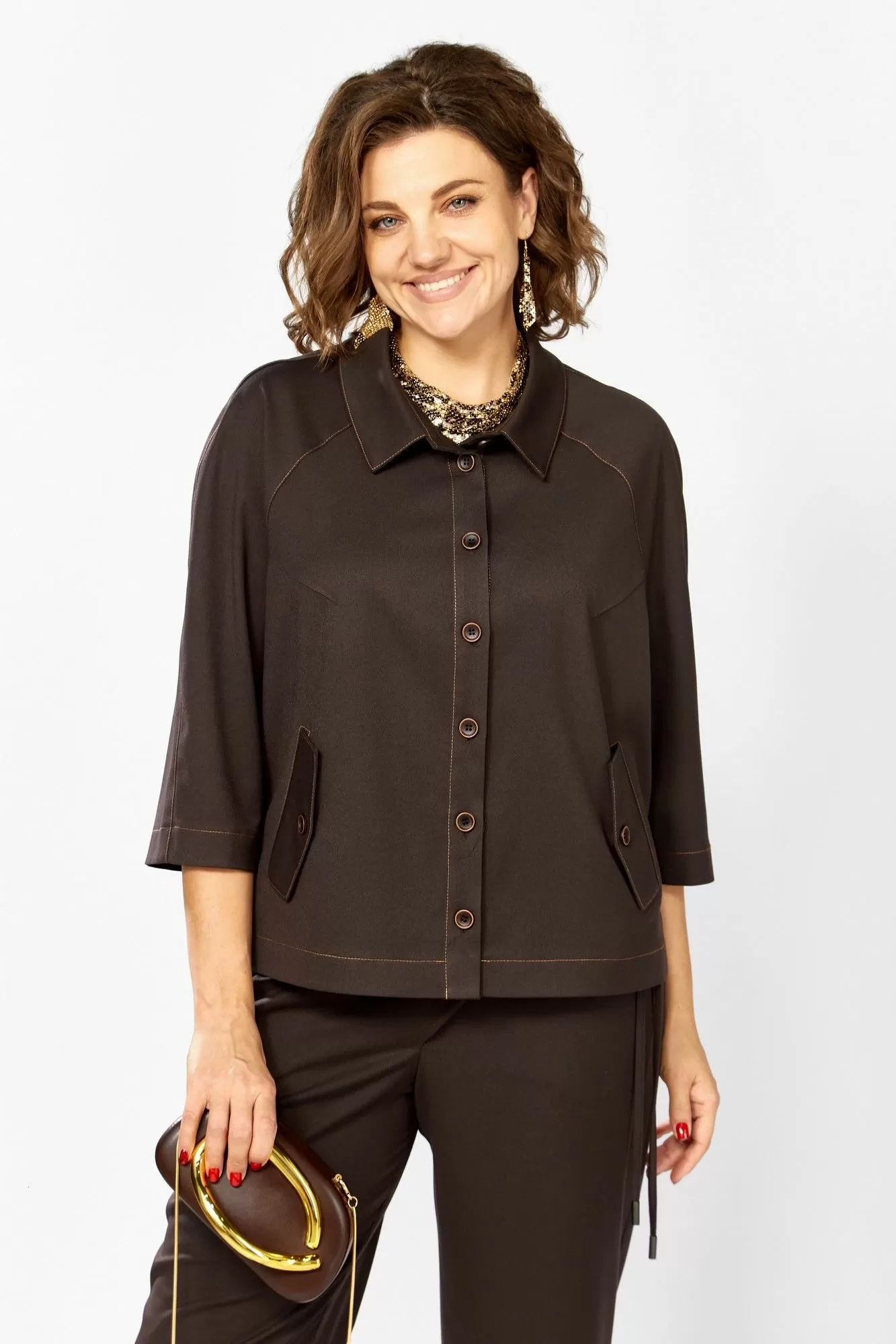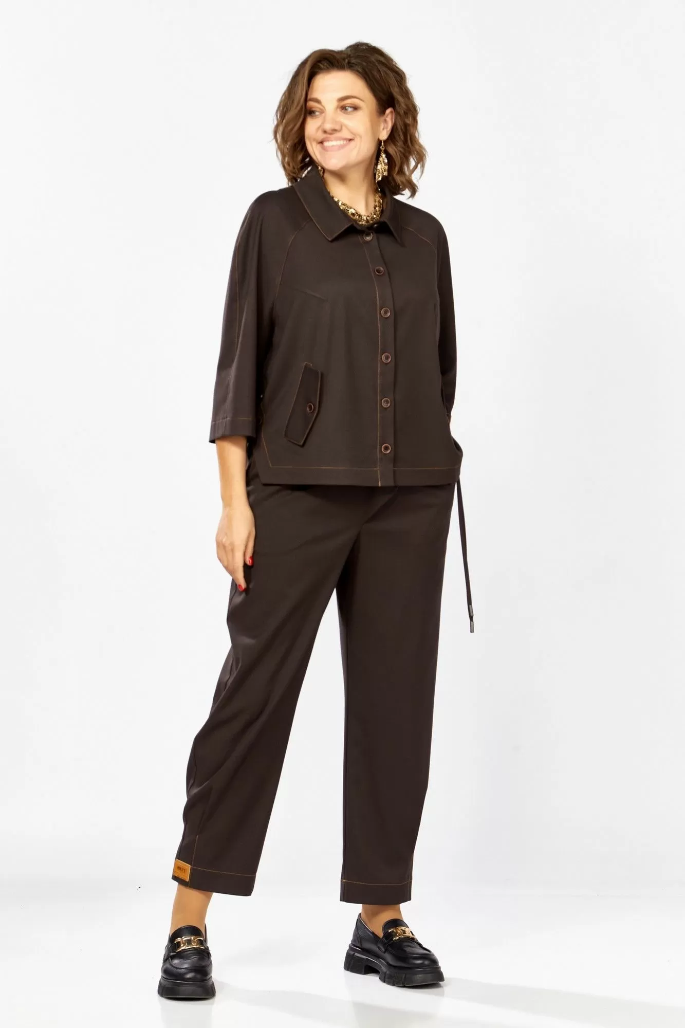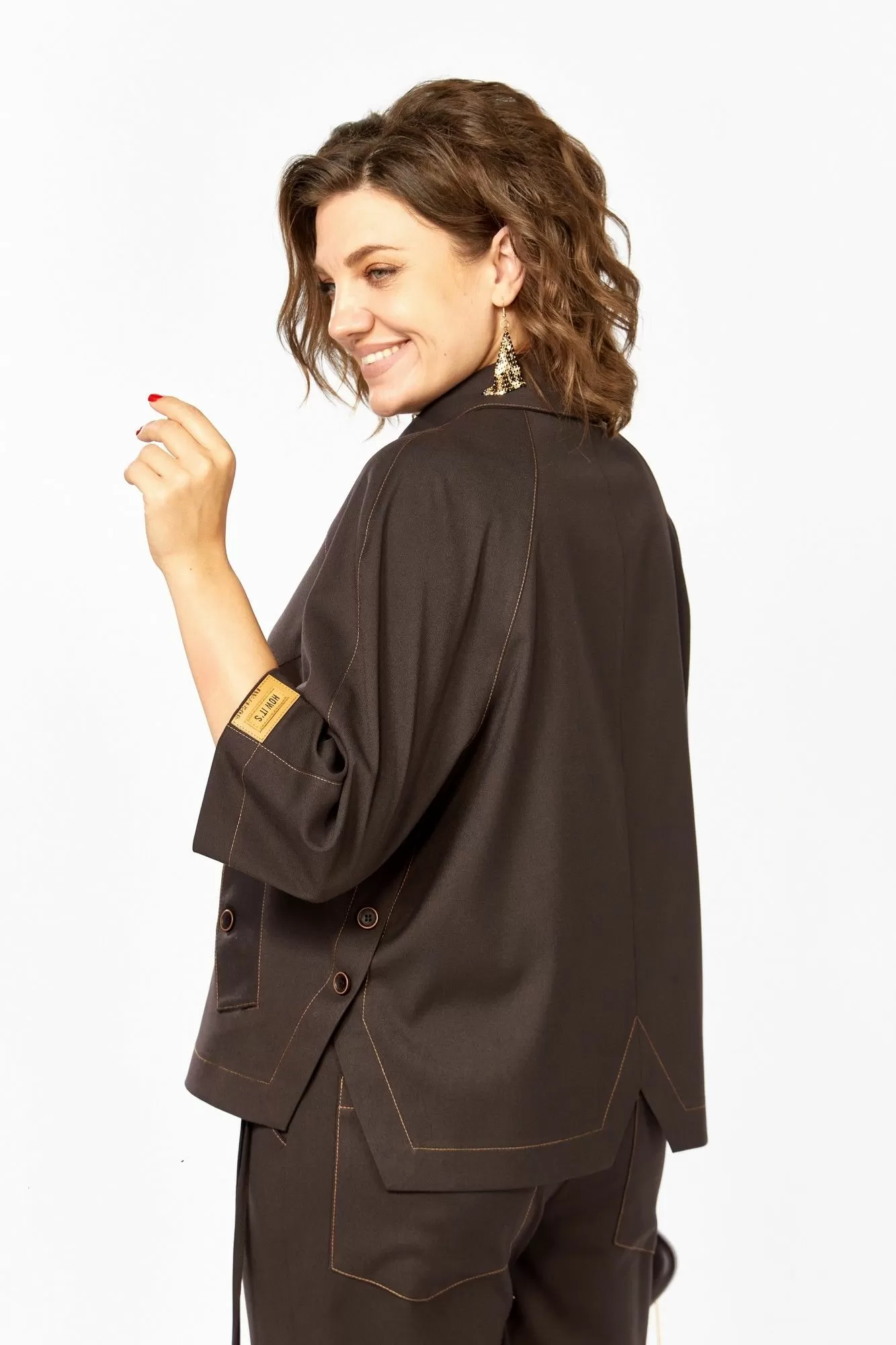 Стильный костюм выполнен из поливискозной костюмной ткани цвета горького шоколада и отстрочен контрастной отделочной строчкой. Свободный крой подарит уверенность и комфорт, а сбалансированные пропорции выгодно подчеркнут вашу фигуру. Жакет прямого силуэта, воротник рубашечный, рукав реглан, спинка со средним швом. Низ спинки фигурной формы, на полочках обработаны карманы с клапаном. В боковых швах жакета обработаны шлицы, которые декорированы пуговицами. Застежка центральная, на петли пуговицы. Брюки прямые, зауженные к низу за счет складок, которые отстрочены контрастной отделочной строчкой. Перед брюк с карманами. Застежка на тесьму-молнию, которая закрыта ассиметричной складкой с завязкой. Задние половинки брюк с накладными карманами. Пояс брюк цельнокроеный, сзади на резинке. Завязки декорированы металлическими наконечниками. Костюм декорирован нашивками, расположенными по низу брюк и низу рукава.