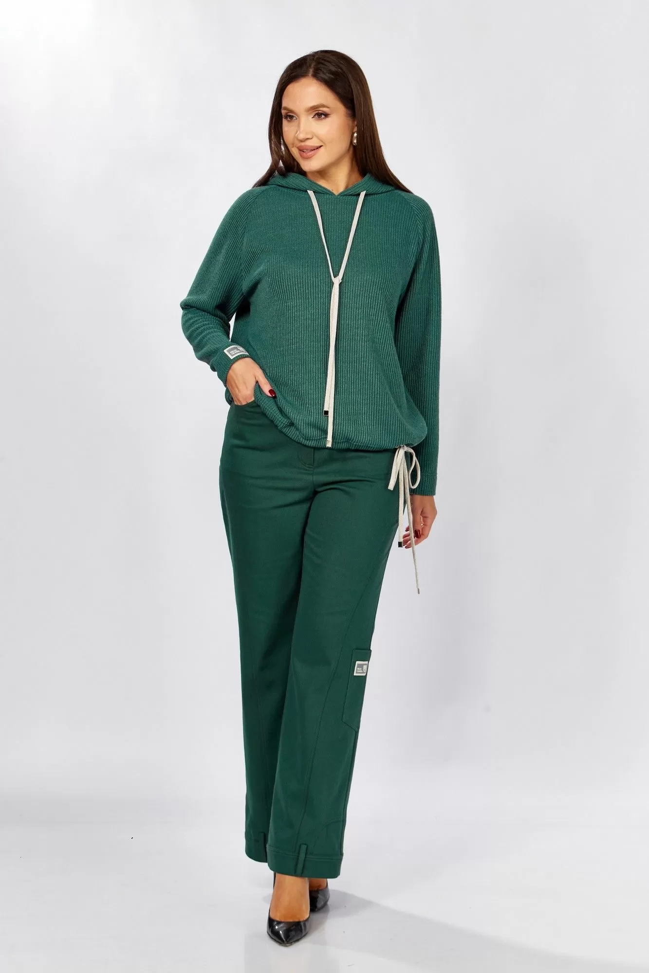 Стильный комплект изумрудного цвета, согреет вас в прохладную осеннюю погоду на прогулке, и не оставит без внимания на работе. Джемпер прямого силуэта с рукавами реглан и капюшоном выполнен из трикотажного полотна. Низ и капюшон с кулиской, в которую продет шнур с декоративными наконечниками.