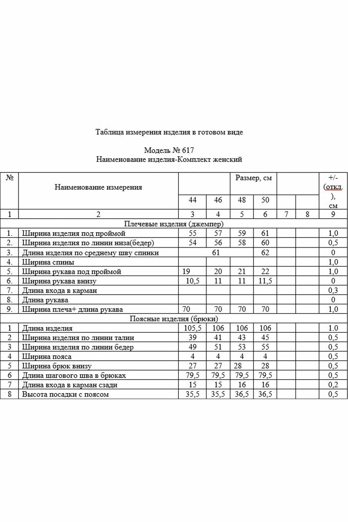 Длина изделия по среднему шву спинки 61-62см, длина рукава70см, длина брюк 105,5-106.
